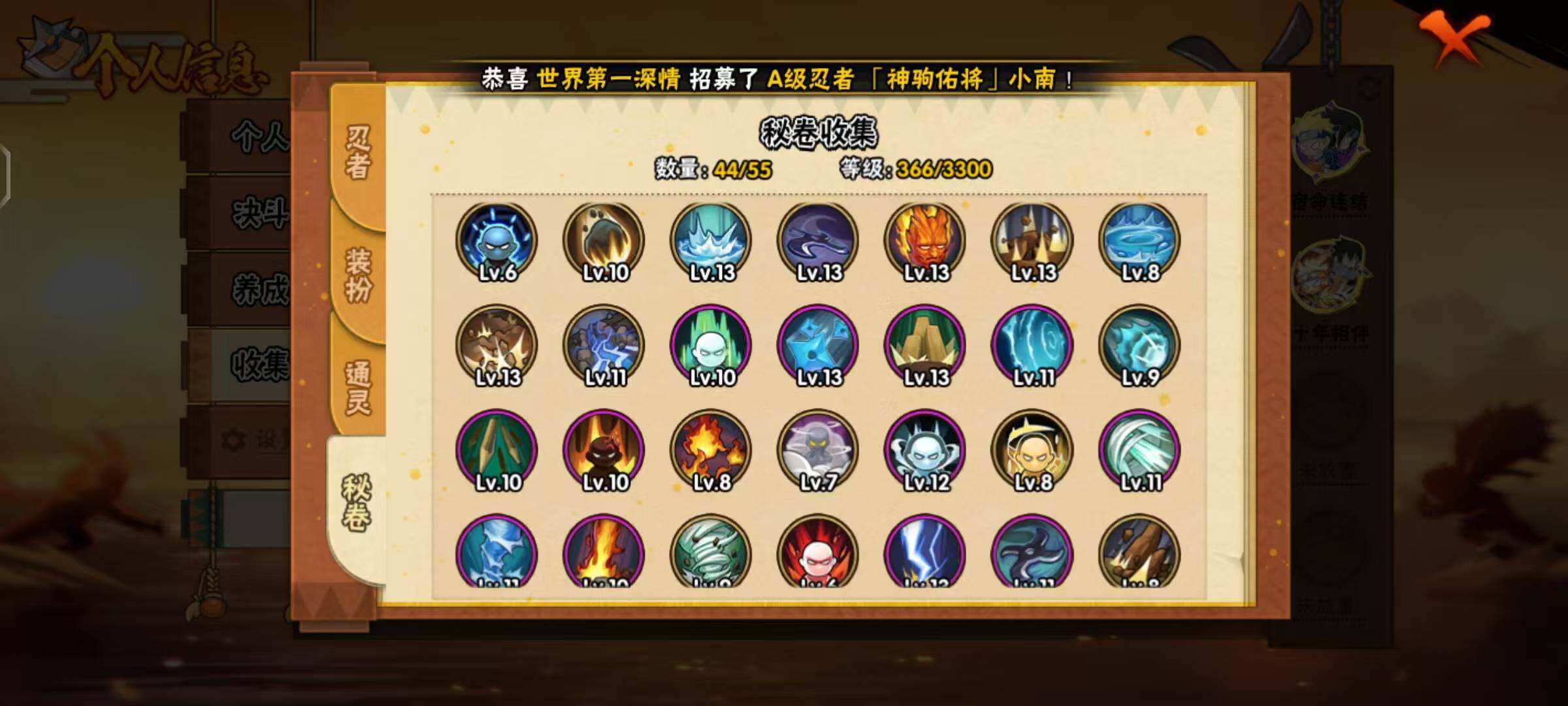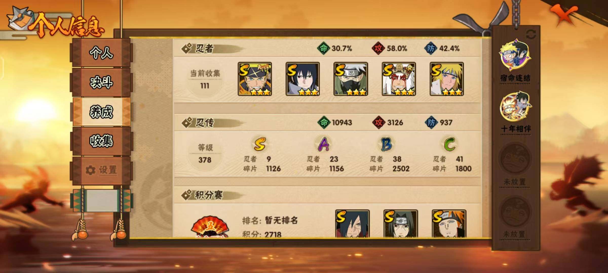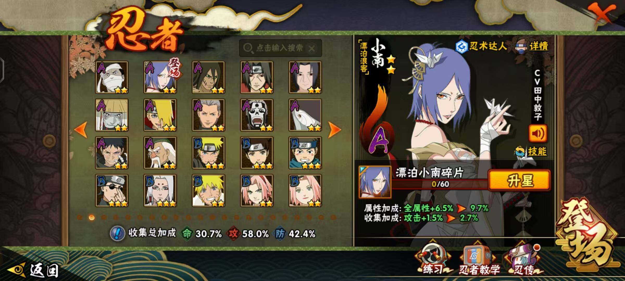 【S级忍者】:宇智波斑「秽土转生·解」(3星),宇智波鼬「须佐能乎」(3星),旗木卡卡西「须佐能乎」(3星),自来也「舞之豪杰」(3星),波风水门(3星),佩恩「天道」(3星),宇智波佐助「永恒万花筒」(3星),大筒木舍人「最终章」(3星),漩涡鸣人·宇智波佐助(3星)