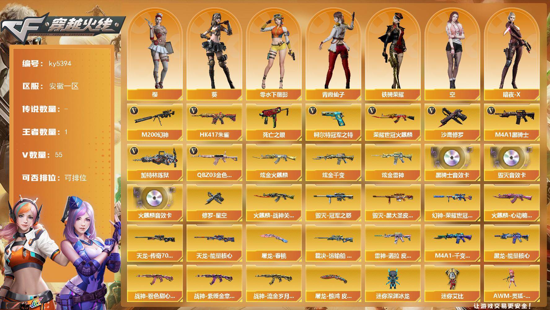 [16883475]安徽一区-56V-1王者武器数-4炫金武器数 【热门武器】:QBZ03-金色蔷薇,HK417-朱雀,M200-幻神,死亡之眼,荣耀世冠-火麒麟,柯尔特-冠军之特,M4A1-黑骑士*2,加特林-炼狱,沙鹰-修罗*5 【王者炫金武器】:炫金火麒麟,炫金千变,炫金雷神*2 【音效卡】:AK47-火麒麟音效卡,M4A1-黑骑士音效卡,Barrett-毁灭音效卡 【皮肤】:M200-幻神-荣耀世冠白鲨,裁决-运输船 皮肤,雷神-诺拉 皮肤,火麒麟-战神关羽,火麒麟-心动糖果,毁灭-冠军之怒,毁灭-黑大圣皮肤,M4A1-千变-孔明皮肤,黑龙-能量核心*2,战神-粉色甜心皮肤,战神-紫绶金章皮肤,战神-流金岁月皮肤,天龙-能量核心,AWM-天龙-传奇70KG,修罗-星空,屠龙-春桃 皮肤,屠龙-惊鸿 皮肤 【角色】:葵,樱,空,暗夜-X,初恋灵狐,虎妞,嘉年华灵狐,娟娟,兰妹妹,零-水下丽影,曼陀罗-X,潘多拉-X,青霞仙子,斯沃特-X,铁骑荣耀,新娜塔莎,雪莉杨 【人偶武器】:AWM-灵狐-15周年嘉年华,迷你深渊冰龙,迷你裂空之翼,迷你波特博士,迷你牛牛*2,闪光弹-小乔,迷你艾比 【暴走生化】:死亡之眼,超级对讲机 【挑战大师】:神圣爆裂者III,AK47-冰龙粉碎者,冰龙粉碎者-白马银枪,激光毁灭者III,神圣爆裂者-末日III,阐释者III 【英雄级武器】:AK47-火麒麟*5,M4A1-黑龙,M4A1-雷神,M4A1-黑骑士*2,AK47-无影,AK47-黑鲨*3,HK417-朱雀,无影-神兵利器,M4A1-玫瑰精灵,QBZ03-金色蔷薇,王者之翼-觉醒版,AK-47-猩红传说,AK47-B-战神,荣耀世冠-火麒麟,AWM-天龙,Barrett-毁灭*2,Barrett-极光,AWM-裁决,M200-幻神,加特林-炼狱,沙鹰-修罗*5,柯尔特-冠军之特,屠龙*3,龙啸,擎天*2,麒麟刺,斩神刀-雷暴,高爆手雷-雷暴*2,闪光弹-雷暴*2,闪光弹-幻灵,烟雾弹-雷暴*2 【道具】:BS战队炫彩背包,CFS限定背包,全能枪王背包*2,战舰背包,背包-葫芦兄弟,虎牙炫彩背包,超级背包,女皇终结者-魔龙之吻,救世主-黑桃战神,黄金生化钩,绿色巨人,灵魂忍者,变异宝贝,迷雾幽灵,生化弹匣,夺命之镰,防化服*3,金色流光-枪王排位*2,星辰流光-枪王排位,枪王排位28赛季金色流