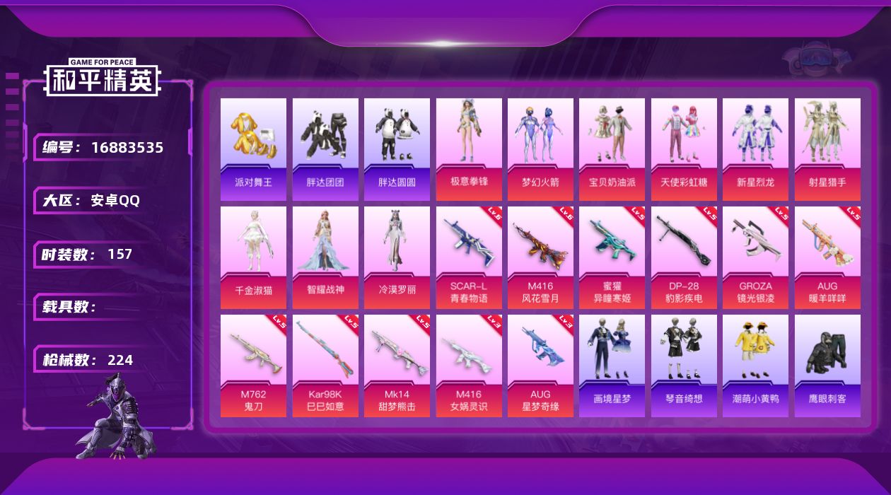 [16883535]安卓 手Q-无敌战神框-9粉装-11特效枪-0载具-2粉色飞行器-69440热力值-8王牌印记-157套装-224枪皮 【热门品类】:粉装-梦幻火箭,套装-浪漫天命,套装-派对舞王,套装-胖达团团,套装-胖达圆圆,套装-龟仙人,套装-潮萌小黄鸭 【粉色套装】:粉装-宝贝奶油派,粉装-天使彩虹糖,粉装-梦幻火箭,粉装-新星烈龙,粉装-射星猎手,角色-千金淑猫,角色-智耀战神,角色-冷漠罗丽,粉装-极意拳锋 【粉色枪皮等级】:SCAR-L-青春物语(六级),M416-风花雪月(六级),M416-女娲灵识(三级),GROZA-镜光银凌(五级),AUG-星梦奇缘(三级),AUG-暖羊咩咩(五级),M762-鬼刀(五级),蜜獾-异瞳寒姬(五级),Kar98K-巳巳如意(五级),Mk14-甜梦熊击(五级),DP-28-豹影疾电(五级) 【粉色枪皮】:SCAR-L-青春物语,M416-风花雪月,M416-女娲灵识,GROZA-镜光银凌,AUG-星梦奇缘,AUG-暖羊咩咩,M762-鬼刀,蜜獾-异瞳寒姬,Kar98K-巳巳如意,Mk14-甜梦熊击,DP-28-豹影疾电 【粉色飞行器】:炫彩糖果飞行器,智趣喵喵飞行器 【粉色降落伞】:甜心宝贝降落伞,梦幻火箭降落伞,第五大道降落伞,拂晓神骑降落伞,闲梦青缨降落伞,莲影清波降落伞,星梦奇缘降落伞,千金淑猫降落伞,戏水时光降落伞,幻星舰长降落伞,幻彩电音降落伞,异瞳寒姬降落伞,炫彩糖果降落伞,暮色玫影降落伞 【稀有套装】:套装-龟仙人,套装-绒宝小鹅,套装-巳巳如意,套装-雪国风尚,套装-炫彩糖果,套装-糖糖葫芦,套装-青团波波,角色-都市丽猫,套装-燕燕于飞,套装-鱼渊荷华,角色-蜜桃派对,套装-紫幽梦,套装-蓝冰羽,角色-瑰梦爱神,套装-霓虹热舞,套装-极速光影,套装-彩虹兔,套装-云朵鹅,套装-雪绒豹,套装-画境星梦,套装-琴音绮想 【稀有枪皮】:AUG-冰晶雪宝,AKM-2P战斗服款,AKM-冰凉西瓜,AKM-夜灯,AKM-彩虹符号,AKM-生命誓言,AKM-破晓战魂,AKM-萌趣颜团子,AKM-虎虎生威,AKM-霓虹街区,AKM-龙的传人,M16A4-夜灯,M16A4-幻世战舞者,SCAR-L-夜灯,SCAR-L-玉兔迎春,SCAR-L-甜蜜旋律,SCAR-L-红色方程式,SCAR-L-黄金龙骨,M416-糯团青竹,M416-