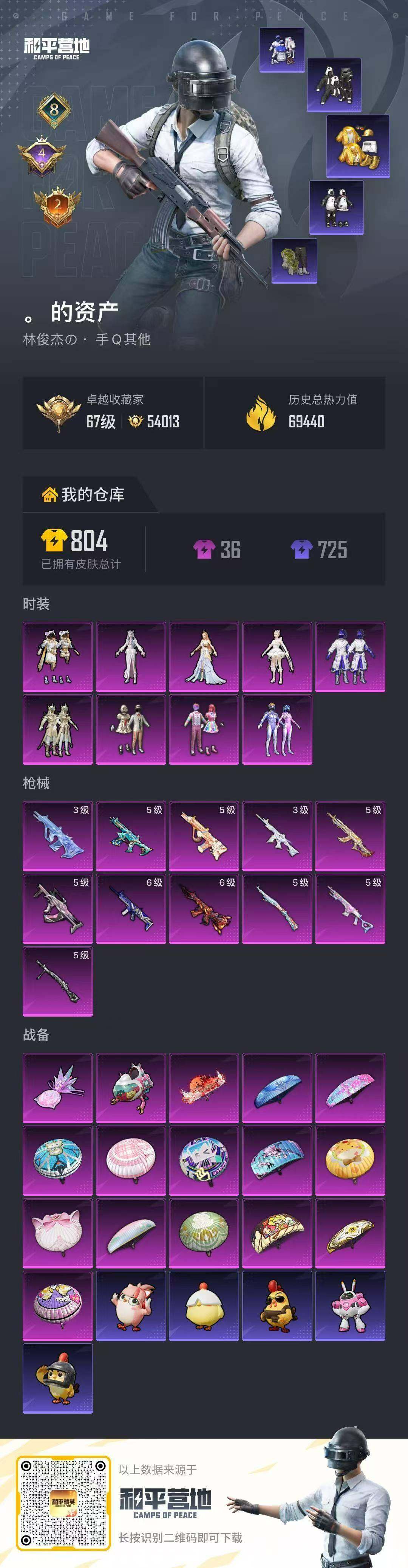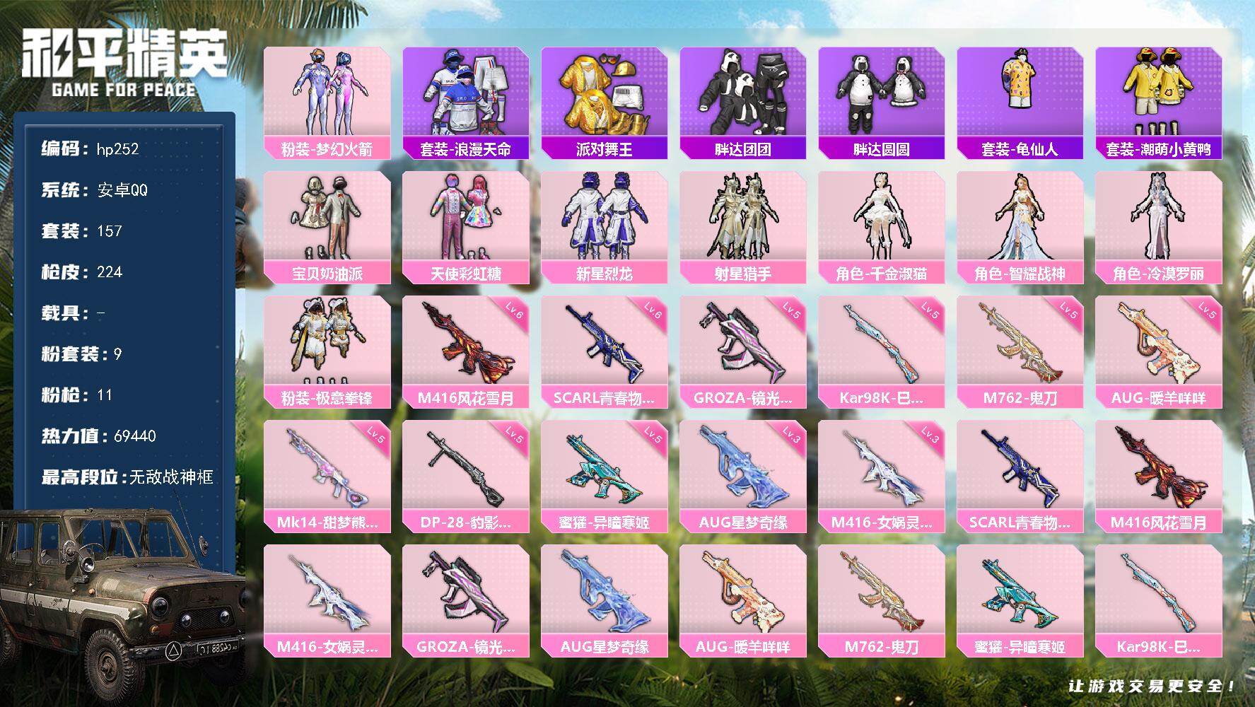 [16883535]安卓 手Q-无敌战神框-9粉装-11特效枪-0载具-2粉色飞行器-69440热力值-8王牌印记-157套装-224枪皮