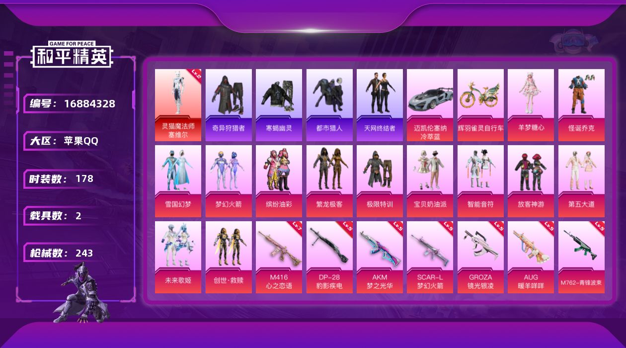 [16884328]【1113】苹果 手Q-1神装-13粉装-13特效枪-2载具-5粉色飞行器-86498热力值-12王牌印记-178套装-243枪皮