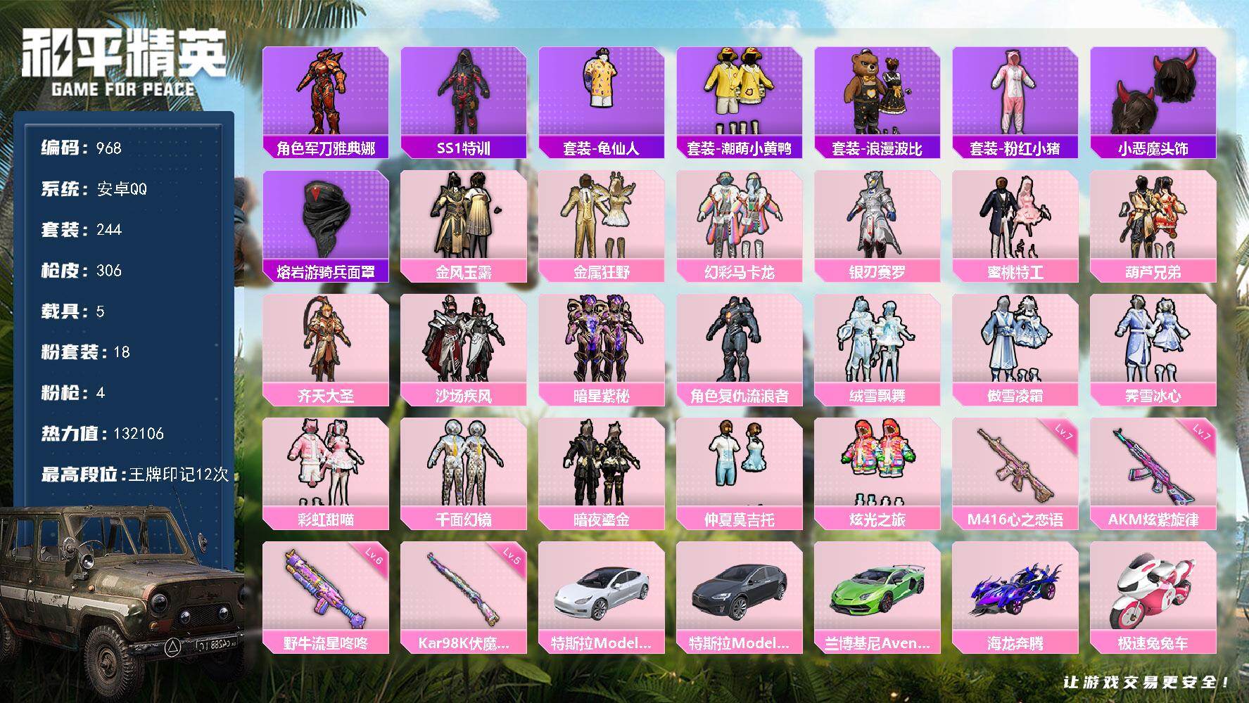 [16884695]【968】安卓 手Q-18粉装-4特效枪-5载具-5粉色飞行器-132106热力值-12王牌印记-244套装-306枪皮