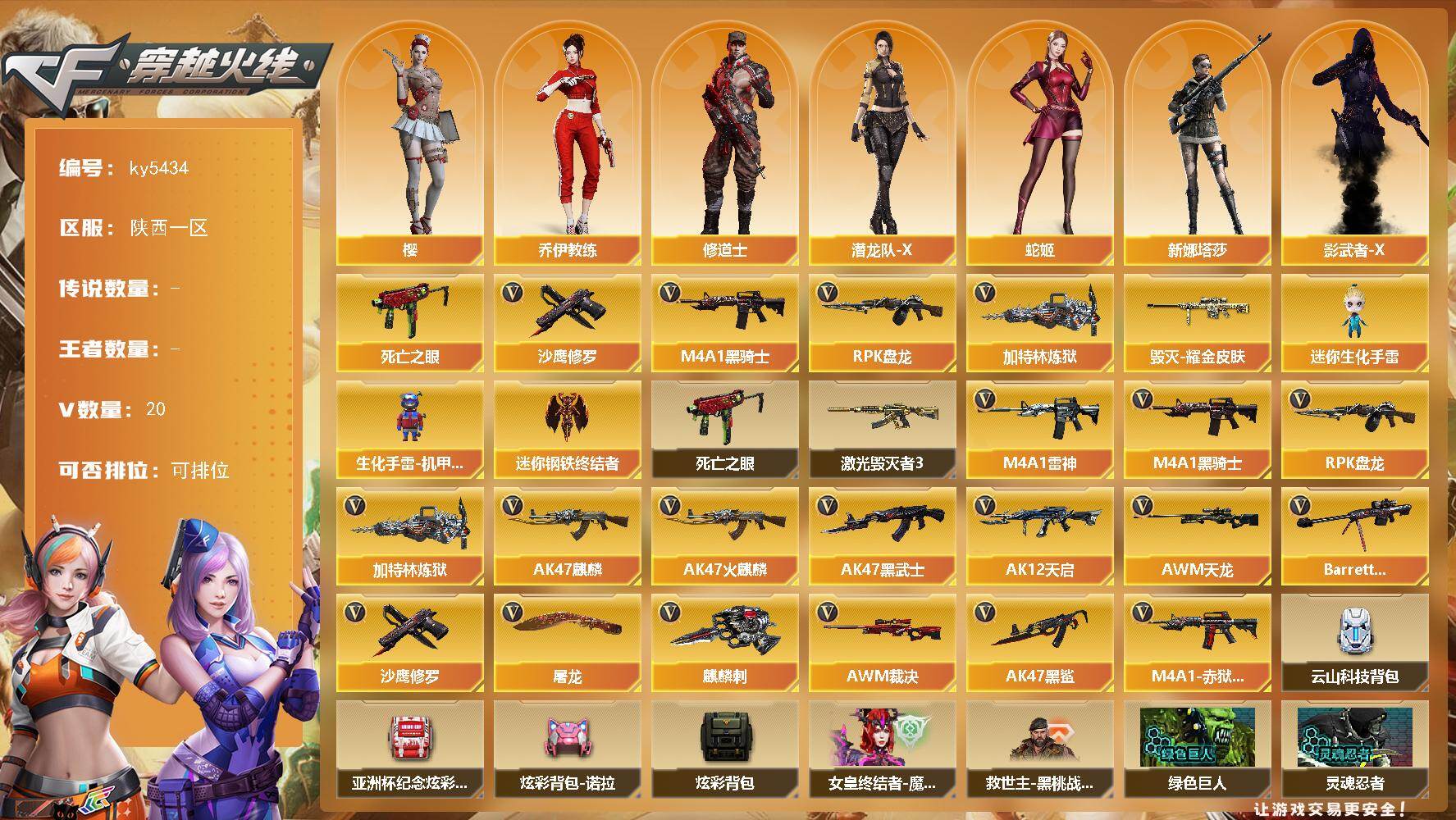 [16885089]陕西一区-20V-0王者武器数-0炫金武器数 【热门武器】:死亡之眼,M4A1-黑骑士,RPK-盘龙*2,加特林-炼狱,沙鹰-修罗 【皮肤】:毁灭耀金皮肤 【角色】:樱,乔伊教练,修道士,潜龙队-X,蛇姬,新娜塔莎,影武者-X 【人偶武器】:迷你钢铁终结者,迷你生化手雷,生化手雷-机甲核心 【暴走生化】:死亡之眼 【挑战大师】:激光毁灭者III 【英雄级武器】:AK47-火麒麟,AK47-麒麟,M4A1-雷神*2,M4A1-黑骑士,AK47-黑武士,AK12-天启,AK47-黑鲨,AWM-天龙,Barrett-毁灭*2,AWM-裁决,RPK-盘龙*2,加特林-炼狱,沙鹰-修罗,屠龙,麒麟刺,M4A1-赤狱骑士 【道具】:云山科技背包,亚洲杯纪念炫彩背包,炫彩背包-诺拉,炫彩背包,女皇终结者-魔龙之吻,救世主-黑桃战神,黄金生化钩,绿色巨人,灵魂忍者,变异宝贝,迷雾幽灵,夺命之镰,防化服*3,枪王排位29赛季金色流光,电玩兔兔表情,动感闪耀表情,C4-沙漠,防弹头盔*4,防弹衣*3,C4工具钳*3,手雷包*3 【特殊枪械】:1黑骑士,2盘龙,1炼狱