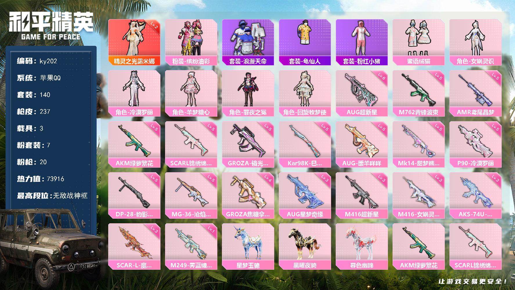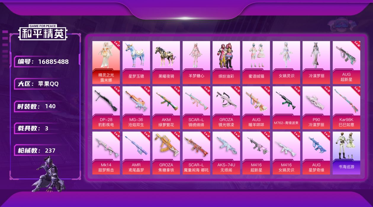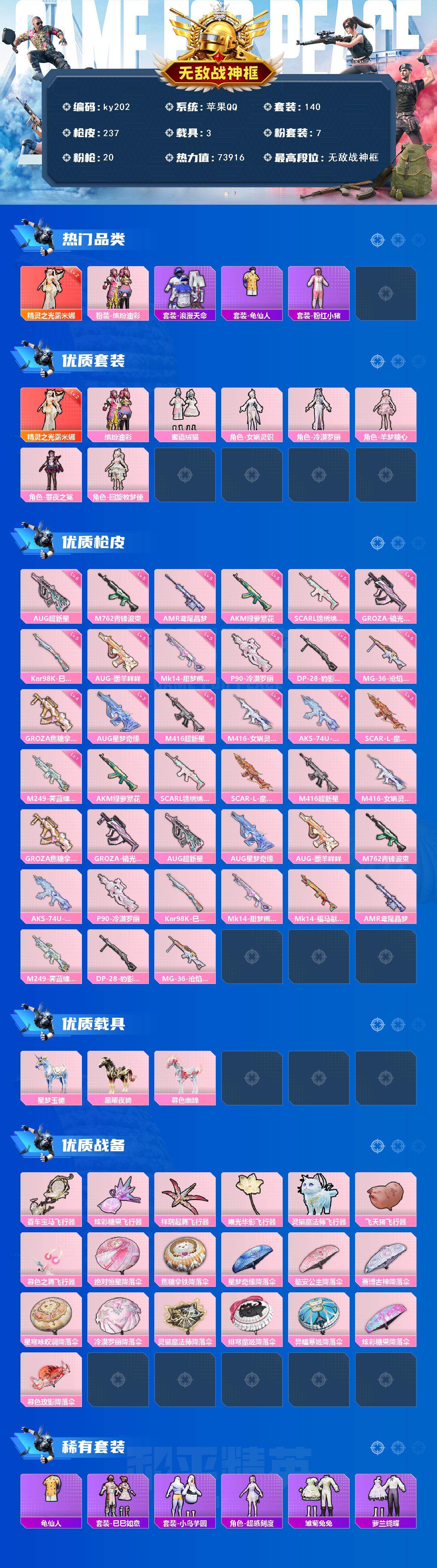 [16885488]苹果 手Q-无敌战神框-1神装-7粉装-20特效枪-3载具-7粉色飞行器-73916热力值-10王牌印记-140套装-237枪皮