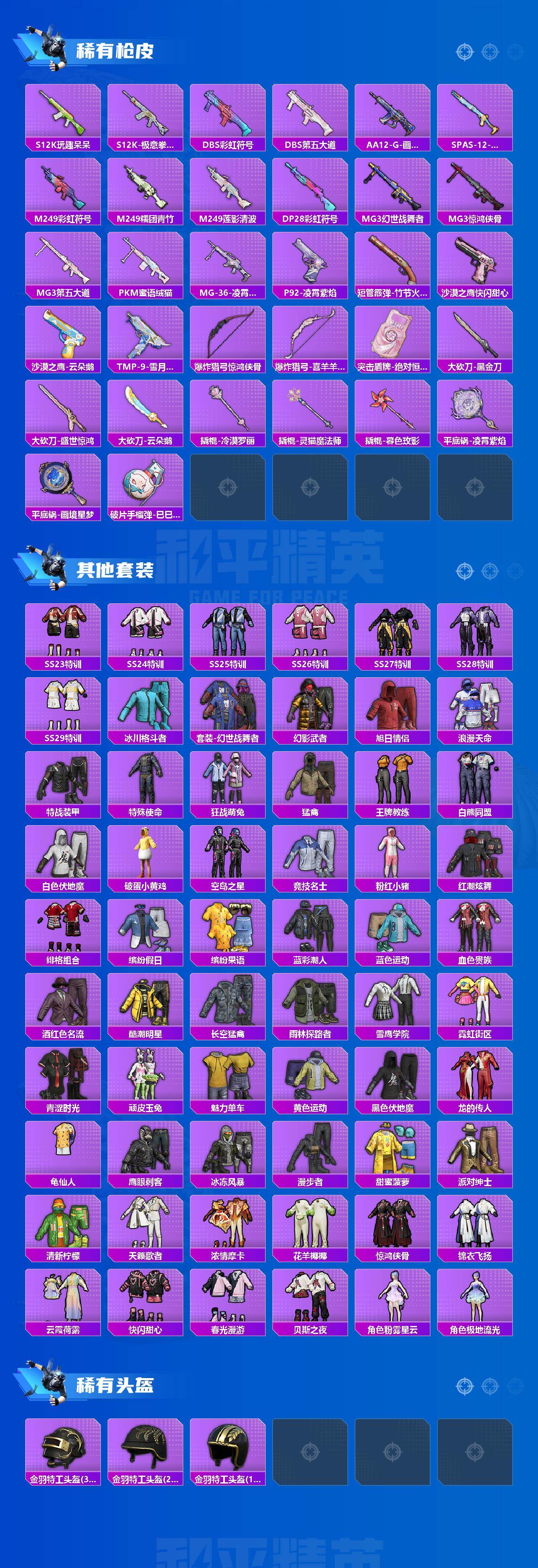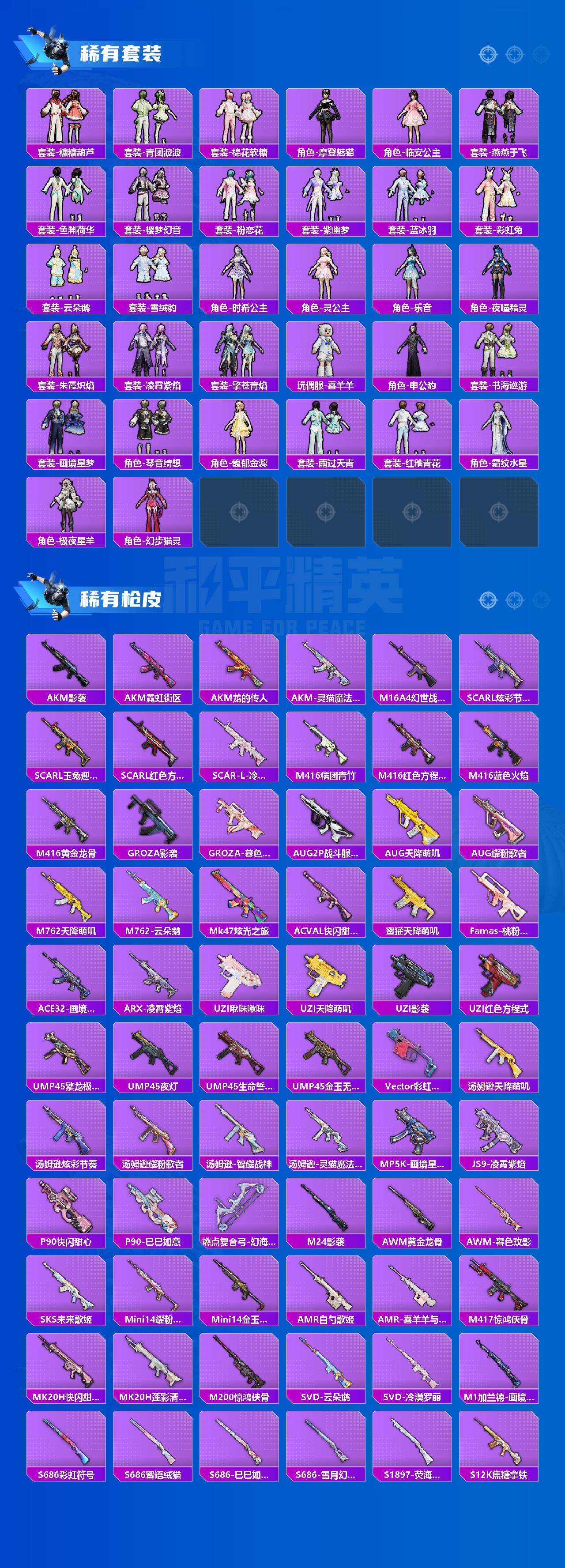 【粉色枪皮】:AKM-绿萝繁花,SCAR-L-锦绣绵绵,SCAR-L-魔童闹海 哪吒,M416-超新星,M416-女娲灵识,GROZA-焦糖拿铁,GROZA-镜光银凌,AUG-超新星,AUG-星梦奇缘,AUG-暖羊咩咩,M762-青锋波束,AKS-74U-无垠阁,P90-冷漠罗丽,Kar98K-巳巳如意,Mk14-甜梦熊击,Mk14-福马献瑞,AMR-鸢尾晶梦,M249-霁蓝缠春,DP-28-豹影疾电,MG-36-沧焰双生