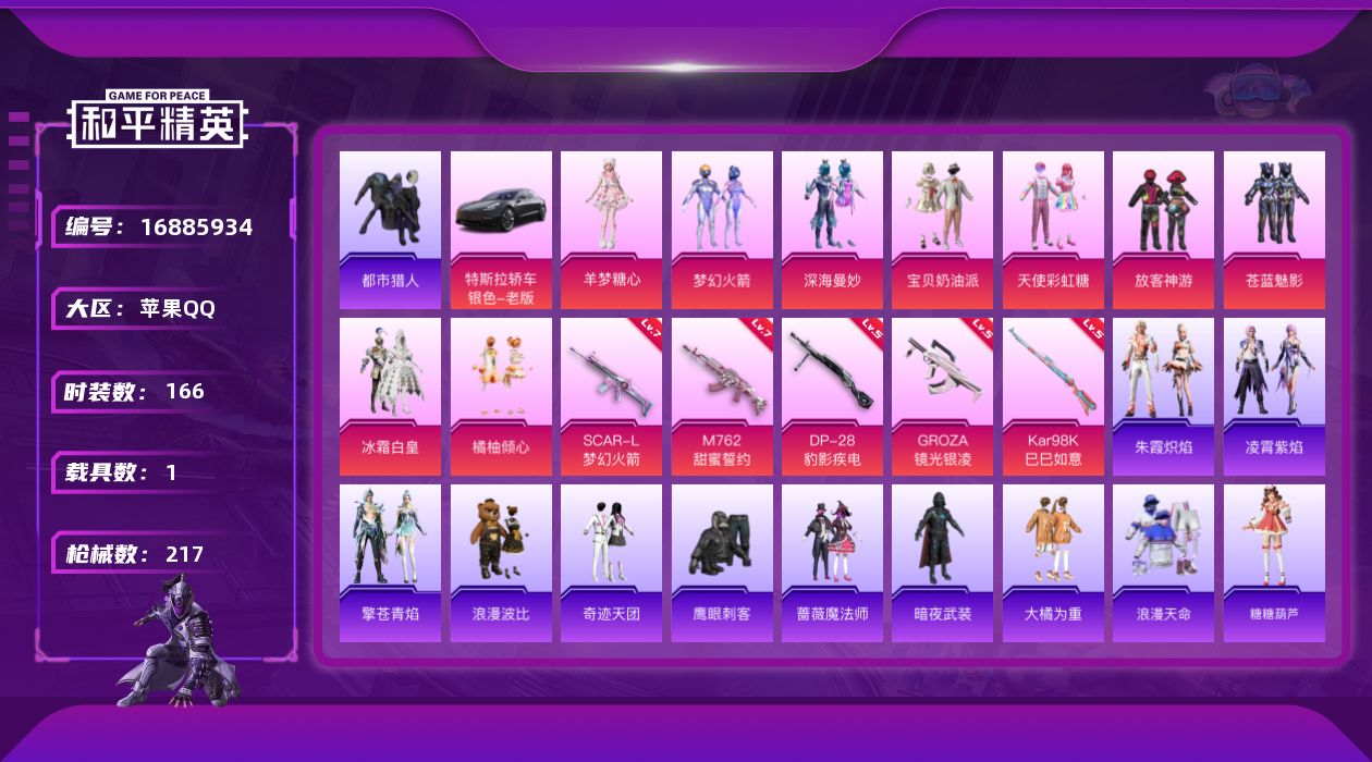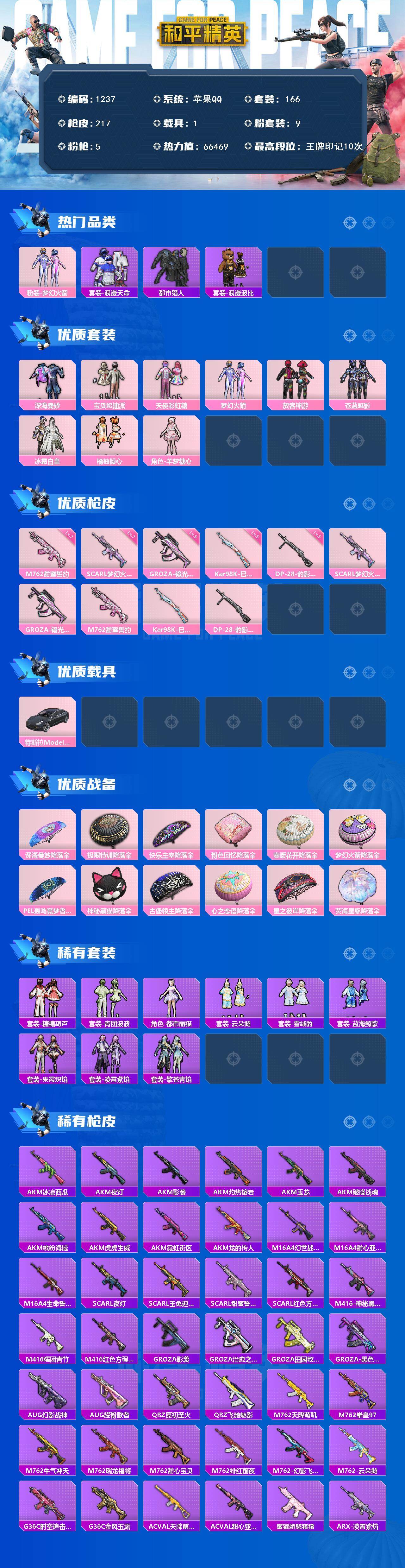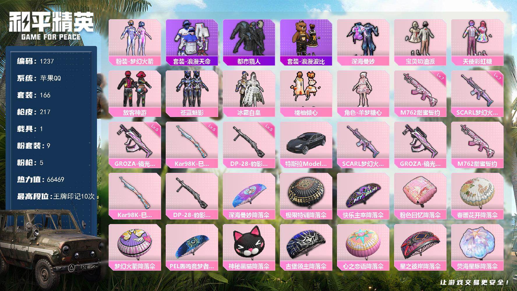 [16885934]【1237】苹果 手Q-9粉装-5特效枪-1载具-1粉色飞行器-66469热力值-10王牌印记-166套装-217枪皮