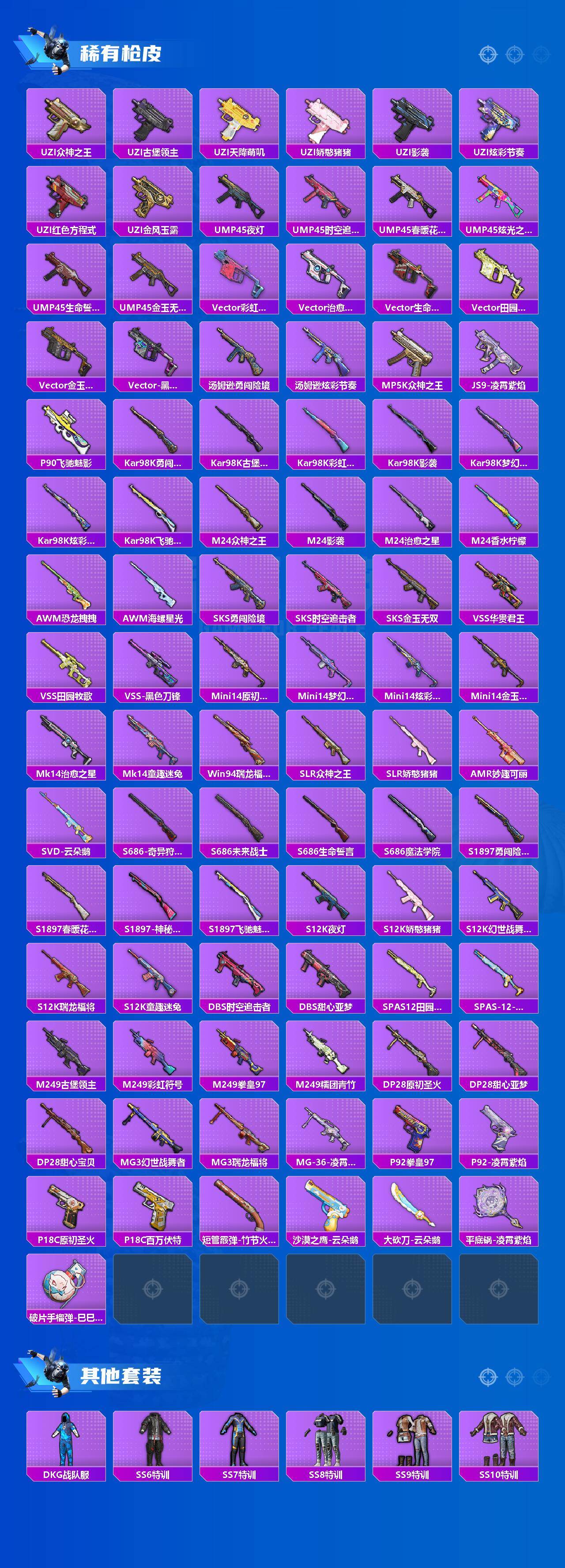 【稀有枪皮】:AKM-冰凉西瓜,AKM-夜灯,AKM-影袭,AKM-灼热熔岩,AKM-玉龙,AKM-破晓战魂,AKM-缤纷海域,AKM-虎虎生威,AKM-霓虹街区,AKM-龙的传人,M16A4-幻世战舞者,M16A4-甜心亚梦,M16A4-生命誓言,SCAR-L-夜灯,SCAR-L-玉兔迎春,SCAR-L-甜蜜誓约,SCAR-L-红色方程式,M416-神秘黑猫,M416-糯团青竹,M416-红色方程式,GROZA-影袭,GROZA-治愈之星,GROZA-田园牧歌,GROZA-黑色刀锋,AUG-幻影战神,AUG-耀粉歌者,QBZ-原初圣火,QBZ-飞驰魅影,M762-天降萌叽,M762-拳皇97,M762-牛气冲天,M762-瑞龙福将,M762-甜心宝贝,M762-绯红前夜,M762-云朵鹅,M762-幻影飞狐,G36C-时空追击者,G36C-金风玉露,AC-VAL-天降萌叽,AC-VAL-甜心亚梦,蜜獾-娇憨猪猪,ARX-凌霄紫焰,UZI-众神之王,UZI-古堡领主,UZI-天降萌叽,UZI-娇憨猪猪,UZI-影