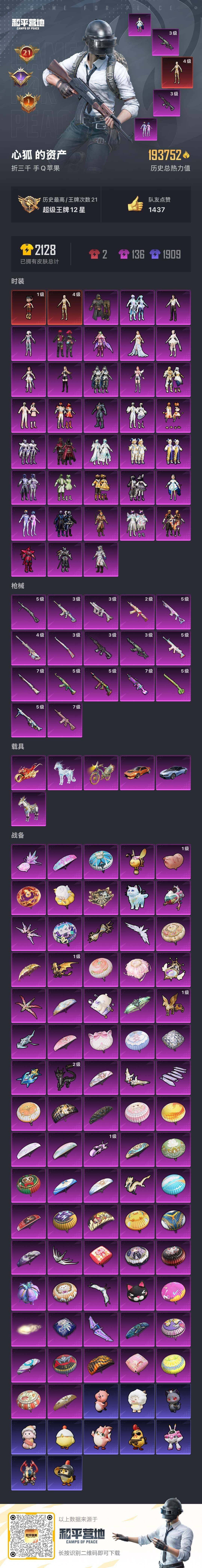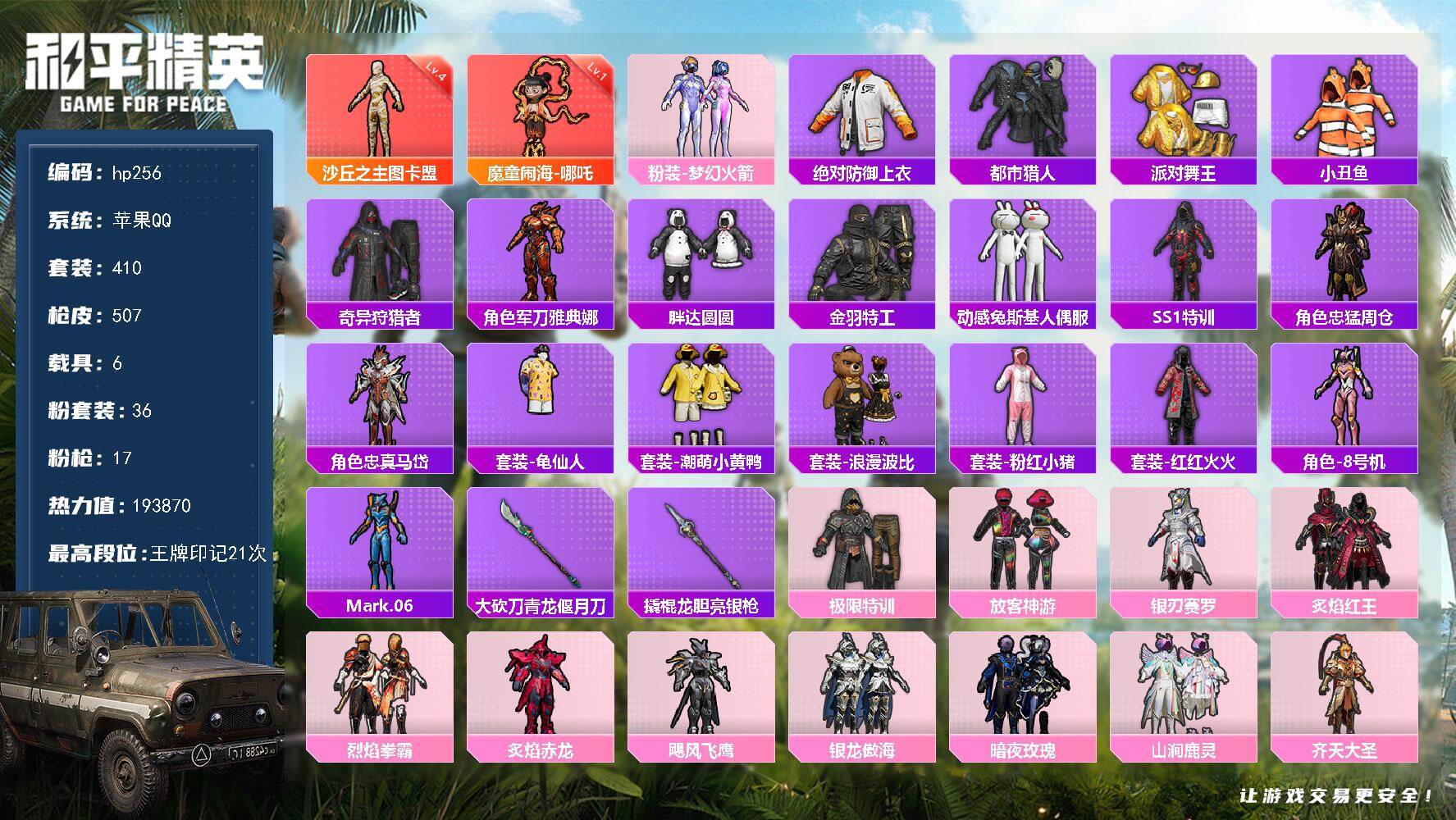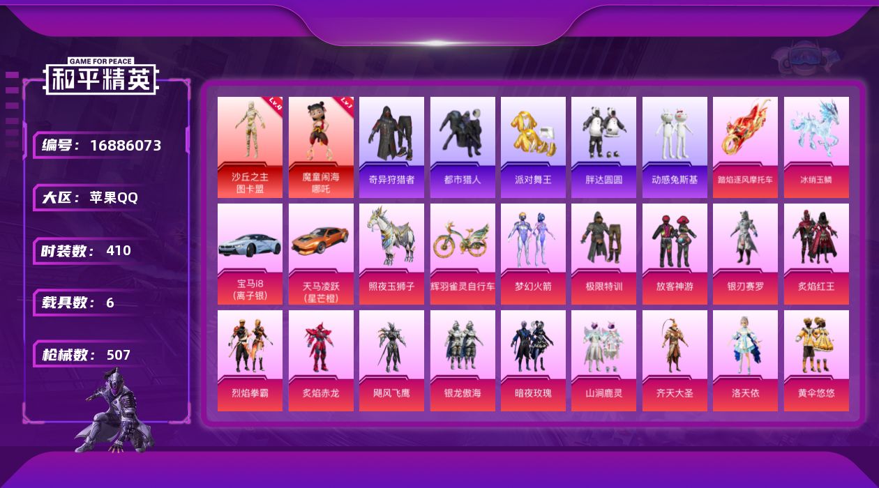 [16886073]苹果 手Q-2神装-36粉装-17特效枪-6载具-24粉色飞行器-193870热力值-21王牌印记-410套装-507枪皮
