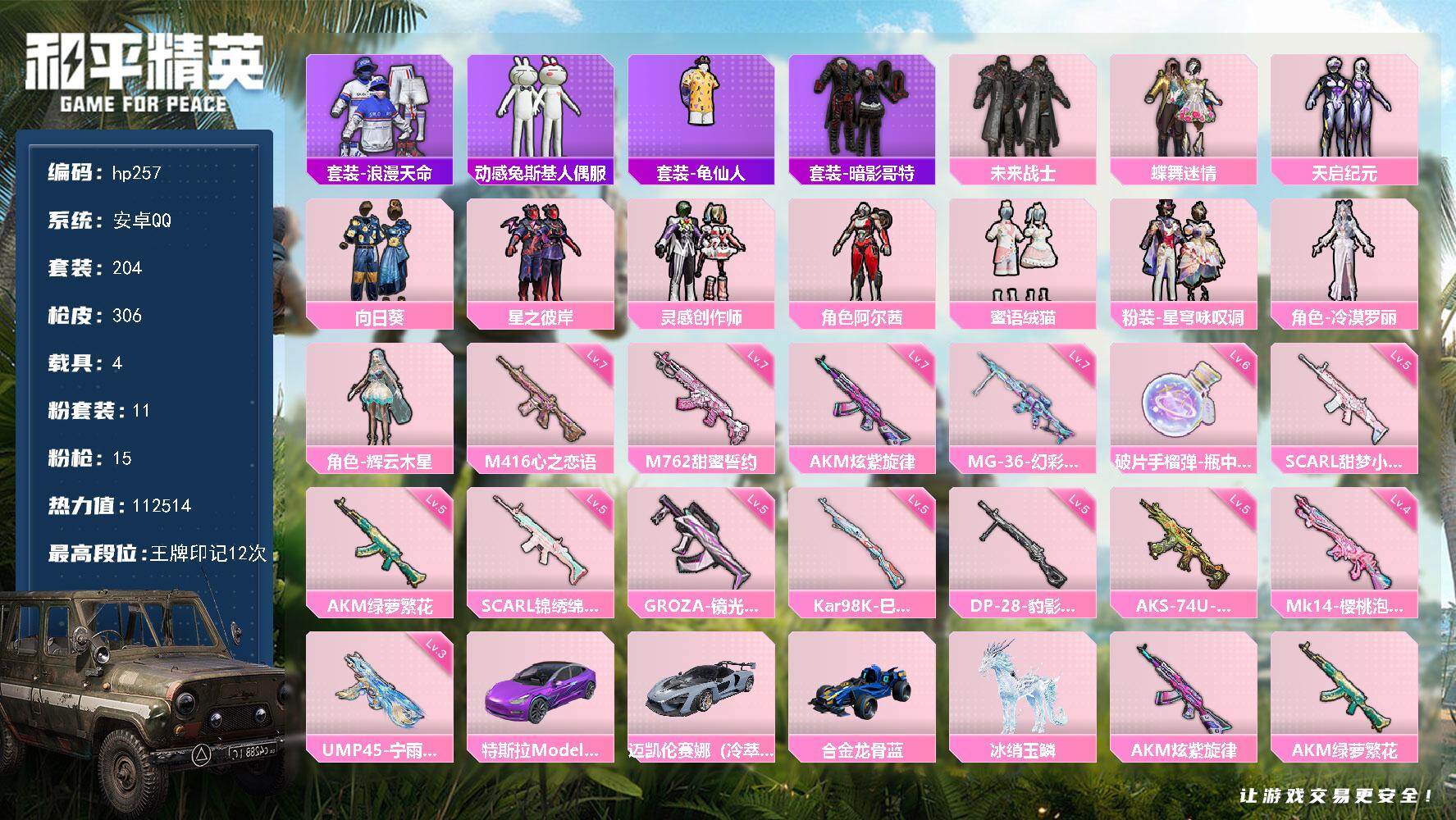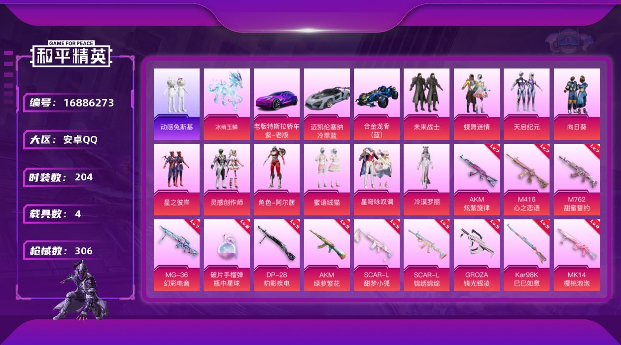 [16886273]安卓 手Q-11粉装-15特效枪-4载具-6粉色飞行器-112514热力值-12王牌印记-204套装-306枪皮