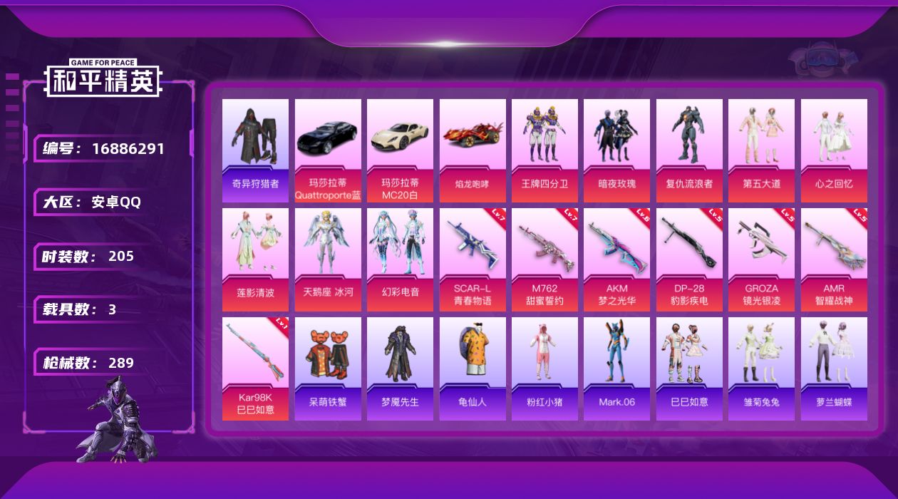 [16886291]【1238】安卓 手Q-8粉装-7特效枪-3载具-5粉色飞行器-93890热力值-21王牌印记-205套装-289枪皮 【热门品类】:套装-奇异狩猎者,套装-龟仙人,套装-粉红小猪,角色-Mark.06 【粉色载具】:玛莎拉蒂MC20(星石白),玛莎拉蒂Quattroporte(夜幕蓝),焰龙咆哮 【粉色套装】:粉装-王牌四分卫,粉装-暗夜玫瑰,角色-复仇流浪者,粉装-第五大道,粉装-心之回忆,粉装-莲影清波,角色-天鹅座 冰河,粉装-幻彩电音 【粉色枪皮等级】:AKM-梦之光华(六级),SCAR-L-青春物语(七级),GROZA-镜光银凌(五级),M762-甜蜜誓约(七级),Kar98K-巳巳如意(一级),AMR-智耀战神(五级),DP-28-豹影疾电(五级) 【粉色枪皮】:AKM-梦之光华,SCAR-L-青春物语,GROZA-镜光银凌,M762-甜蜜誓约,Kar98K-巳巳如意,AMR-智耀战神,DP-28-豹影疾电 【粉色飞行器】:机甲封神飞行器,齐天大圣飞行器,太空嘟嘟飞行器,霓虹漫游飞行器,星空武士飞行器 【粉色降落伞】:四圣焕新降落伞,银刃赛罗降落伞,王牌四分卫降落伞,星之彼岸降落伞,洛神天依降落伞,筑梦精灵降落伞,环太平洋降落伞,旋转彩虹降落伞,第五大道降落伞,纯梦嫁纱降落伞,龙珠超降落伞,黄族统领降落伞,未来歌姬降落伞,初号机 觉醒Ver.降落伞,未来领航者降落伞,幻彩电音降落伞,时光之誓降落伞 【稀有套装】:套装-龟仙人,套装-巳巳如意,套装-雏菊兔兔,套装-萝兰蝴蝶,套装-小熊娃娃,套装-先驱飞行员,套装-糖糖葫芦,套装-青团波波,套装-燕燕于飞,套装-鱼渊荷华,套装-粉恋花,套装-紫幽梦,套装-蓝冰羽,套装-云朵鹅,套装-雪绒豹,角色-时希公主 【稀有枪皮】:AKM-四圣焕新,AKM-墨染幽兰,AKM-夜灯,AKM-彩虹符号,AKM-影袭,AKM-恐龙拽拽,AKM-星之彼岸,AKM-灼热熔岩,AKM-生命誓言,AKM-破晓战魂,AKM-缤纷海域,AKM-萌趣颜团子,AKM-虎虎生威,AKM-霓虹街区,AKM-龙的传人,M16A4-幻世战舞者,M16A4-甜心亚梦,M16A4-红色方程式,SCAR-L-幽秘魅影,SCAR-L-流星咚咚,SCAR-L-炫彩节奏,SCAR-L-玉兔迎春,SCAR-L-红色方程式,SCAR-L-黄金龙骨,SCAR-L