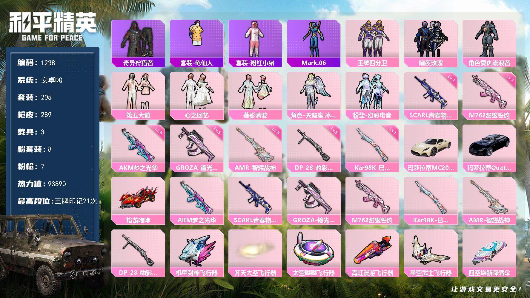 [16886291]【1238】安卓 手Q-8粉装-7特效枪-3载具-5粉色飞行器-93890热力值-21王牌印记-205套装-289枪皮