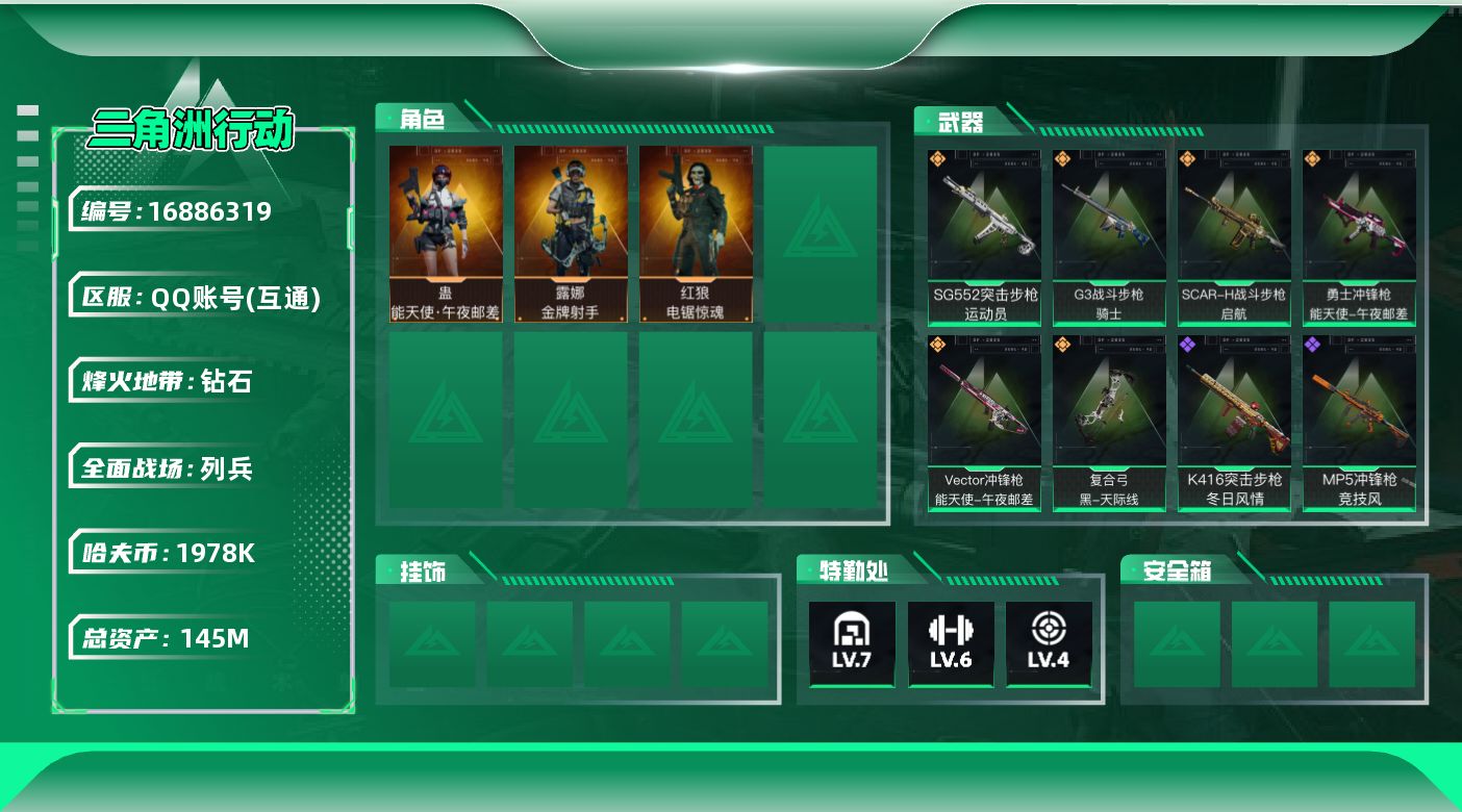 [16886319]可二次【特价出售/店主推荐】145m总资产-1978k哈伏币-60烽火等级-钻石-23战场等级-列兵 【干员外观】:蛊-能天使午夜邮差,红狼-电锯惊魂,露娜-金牌射手 【近战皮肤】:近战-黑鹰 【传说外观】:SG552突击步枪-运动员,SCAR-H战斗步枪-启航,G3战斗步枪-骑士,Vector冲锋枪-能天使-午夜邮差,勇士冲锋枪-能天使-午夜邮差,复合弓-黑·天际线 【史诗外观】:K416突击步枪-冬日风情,M7战斗步枪-百步穿杨,G3战斗步枪-流沙送葬,AS Val突击步枪-百步穿杨,MP5冲锋枪-深海恐惧,MP5冲锋枪-战术竞备,MP5冲锋枪-竞技风,Vector冲锋枪-阿萨拉文明,Vector冲锋枪-百步穿杨,勇士冲锋枪-工业狂潮,PKM通用机枪-蝮蛇,SV-98狙击步枪-林中猎手,SV-98狙击步枪-囚徒,M700狙击步枪-蝮蛇,M700狙击步枪-百步穿杨,AWM狙击步枪-流沙送葬 【稀有外观】:G18-银灰金属,M700狙击步枪-极地勘察队,SCAR-H战斗步枪-旧梦,M4A1突击步枪-繁盛,AKM突击步枪-肃杀,QBZ95-1突击步枪-公平竞技,ASh-12战斗步枪-繁盛,M16A4突击步枪-街头涂鸦,M7战斗步枪-捣蛋鬼,SG552突击步枪-2026,AK-12突击步枪-零点,SCAR-H战斗步枪-荣耀列队,PTR-32突击步枪-天网,腾龙突击步枪-冰天雪地,MP5冲锋枪-哈夫克卫队,P90冲锋枪-黄昏,Vector冲锋枪-先锋,UZI冲锋枪-精英联盟,UZI冲锋枪-亚特兰蒂斯,野牛冲锋枪-精英联盟,SMG-45-行动开启,勇士冲锋枪-主宰,勇士冲锋枪-冰天雪地,M1014霰弹枪-幻影结构,M249轻机枪-冰天雪地,Mini-14射手步枪-荣耀列队,SR-9射手步枪-街头涂鸦,PSG-1射手步枪-主宰 【普通外观】:AKS-74U突击步枪-蛇纹涂装,R93狙击步枪-监察,M249轻机枪-古铜,G17-古铜,M7战斗步枪-噬菌体,M4A1突击步枪-粉色涂装,M4A1突击步枪-高雅黑,M4A1突击步枪-海色,QBZ95-1突击步枪-高雅黑,QBZ95-1突击步枪-三角洲力量,QBZ95-1突击步枪-海色,QBZ191突击步枪-三角洲力量,K416突击步枪-几何迷彩,K416突击步枪-高雅黑,M16A4突击步枪-山林猎人,M16A4突击步枪-高雅黑,AU