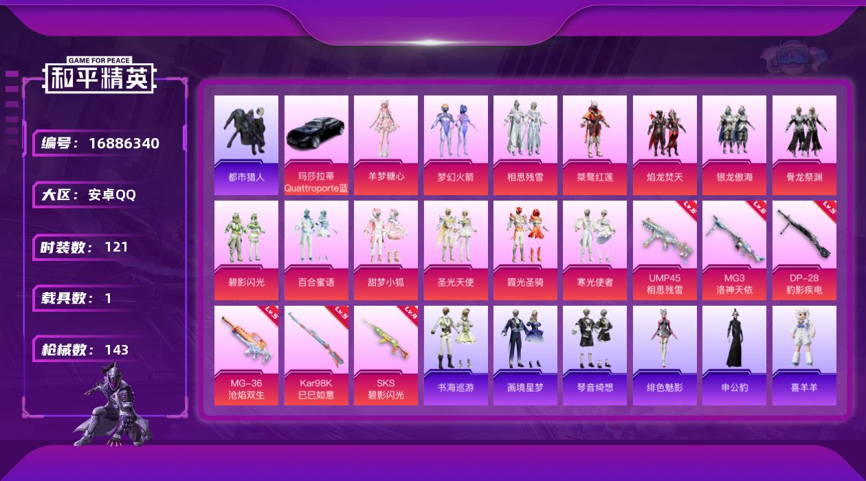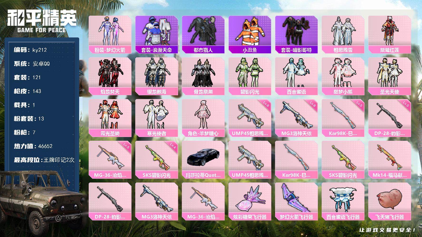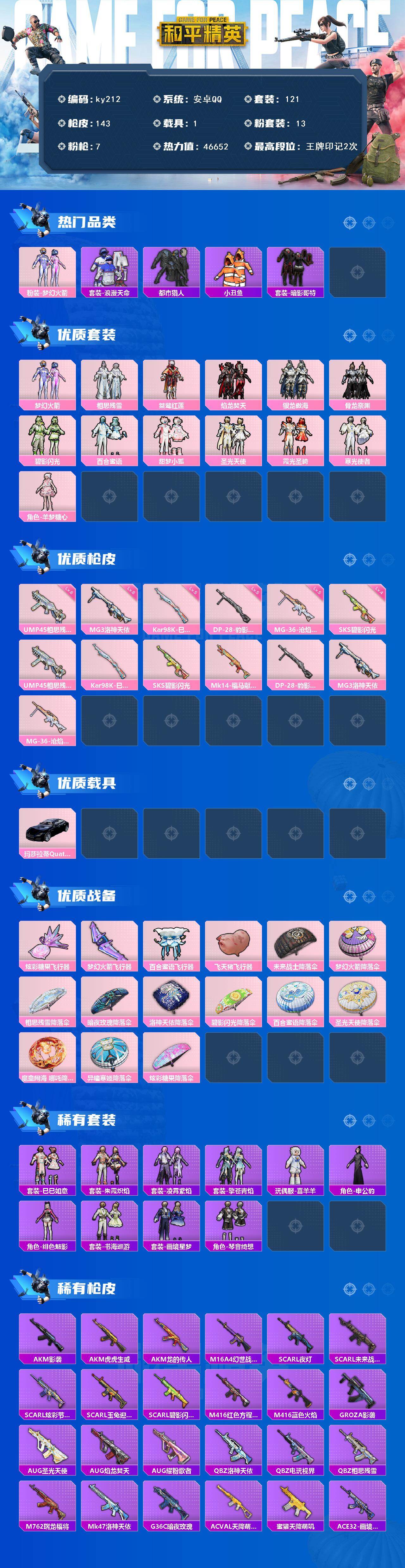 [16886340]安卓 手Q-13粉装-7特效枪-1载具-5粉色飞行器-46652热力值-2王牌印记-121套装-143枪皮 【热门品类】:粉装-梦幻火箭,套装-浪漫天命,套装-都市猎人,套装-小丑鱼,套装-暗影哥特 【粉色套装】:粉装-梦幻火箭,粉装-相思残雪,粉装-桀骜红莲,粉装-焰龙焚天,粉装-银龙傲海,粉装-骨龙祭渊,粉装-碧影闪光,粉装-百合蜜语,粉装-甜梦小狐,粉装-圣光天使,粉装-霞光圣骑,粉装-寒光使者,角色-羊梦糖心 【粉色枪皮等级】:UMP45-相思残雪(六级),Kar98K-巳巳如意(五级),SKS-碧影闪光(四级),DP-28-豹影疾电(五级),MG3-洛神天依(六级),MG-36-沧焰双生(五级) 【粉色载具】:玛莎拉蒂Quattroporte(夜幕蓝) 【粉色枪皮】:UMP45-相思残雪,Kar98K-巳巳如意,SKS-碧影闪光,Mk14-福马献瑞,DP-28-豹影疾电,MG3-洛神天依,MG-36-沧焰双生 【粉色飞行器】:炫彩糖果飞行器,梦幻火箭飞行器,百合蜜语飞行器,飞天猪飞行器 【粉色降落伞】:未来战士降落伞,梦幻火箭降落伞,相思残雪降落伞,暗夜玫瑰降落伞,洛神天依降落伞,碧影闪光降落伞,百合蜜语降落伞,圣光天使降落伞,魔童闹海 哪吒降落伞,异瞳寒姬降落伞,炫彩糖果降落伞 【稀有套装】:套装-巳巳如意,套装-雪国风尚,套装-炫彩糖果,套装-朱霞炽焰,套装-凌霄紫焰,套装-擎苍青焰,玩偶服-喜羊羊,角色-申公豹,角色-绯色魅影,套装-书海巡游,套装-画境星梦,套装-琴音绮想 【稀有枪皮】:AUG-冰晶雪宝,AKM-影袭,AKM-虎虎生威,AKM-龙的传人,M16A4-幻世战舞者,SCAR-L-夜灯,SCAR-L-未来战士,SCAR-L-炫彩节奏,SCAR-L-玉兔迎春,SCAR-L-碧影闪光,M416-红色方程式,M416-蓝色火焰,GROZA-影袭,AUG-圣光天使,AUG-焰龙焚天,AUG-耀粉歌者,QBZ-洛神天依,QBZ-电玩视界,QBZ-相思残雪,M762-瑞龙福将,Mk47-洛神天依,G36C-暗夜玫瑰,AC-VAL-天降萌叽,蜜獾-天降萌叽,ACE32-画境星梦,ARX-凌霄紫焰,UZI-天降萌叽,UZI-影袭,UZI-炫彩节奏,UZI-金玉无双,UMP45-夜灯,UMP45-生命誓言,Vector-彩虹符号,Vector-生命誓言,