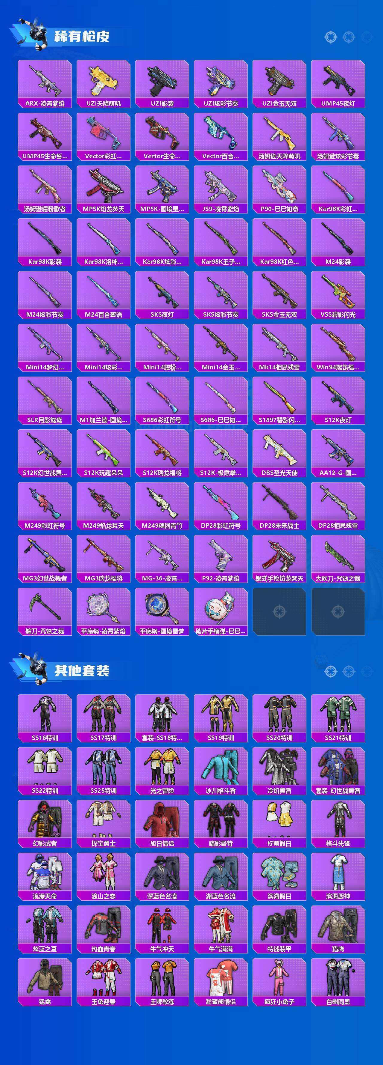 【稀有枪皮】:AUG-冰晶雪宝,AKM-影袭,AKM-虎虎生威,AKM-龙的传人,M16A4-幻世战舞者,SCAR-L-夜灯,SCAR-L-未来战士,SCAR-L-炫彩节奏,SCAR-L-玉兔迎春,SCAR-L-碧影闪光,M416-红色方程式,M416-蓝色火焰,GROZA-影袭,AUG-圣光天使,AUG-焰龙焚天,AUG-耀粉歌者,QBZ-洛神天依,QBZ-电玩视界,QBZ-相思残雪,M762-瑞龙福将,Mk47-洛神天依,G36C-暗夜玫瑰,AC-VAL-天降萌叽,蜜獾-天降萌叽,ACE32-画境星梦,ARX-凌霄紫焰,UZI-天降萌叽,UZI-影袭,UZI-炫彩节奏,UZI-金玉无双,UMP45-夜灯,UMP45-生命誓言,Vector-彩虹符号,Vector-生命誓言,