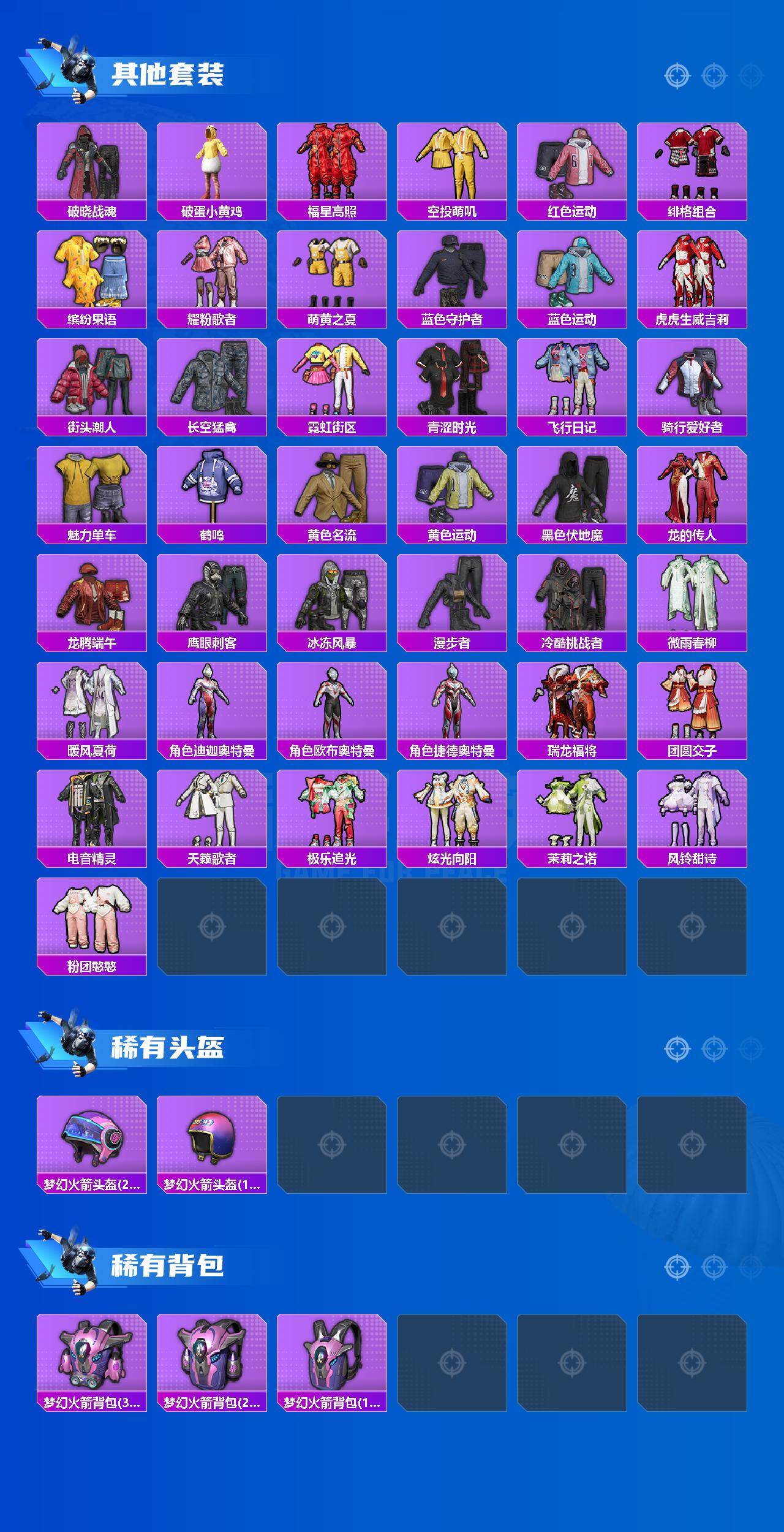 套装-梦幻火箭,套装-都市猎人,套装-相思残雪,套装-桀骜红莲,套装-焰龙焚天,套装-银龙傲海,套装-骨龙祭渊,套装-碧影闪光,套装-百合蜜语,套装-甜梦小狐,套装-圣光天使,套装-霞光圣骑,套装-寒光使者,套装-鹰眼刺客