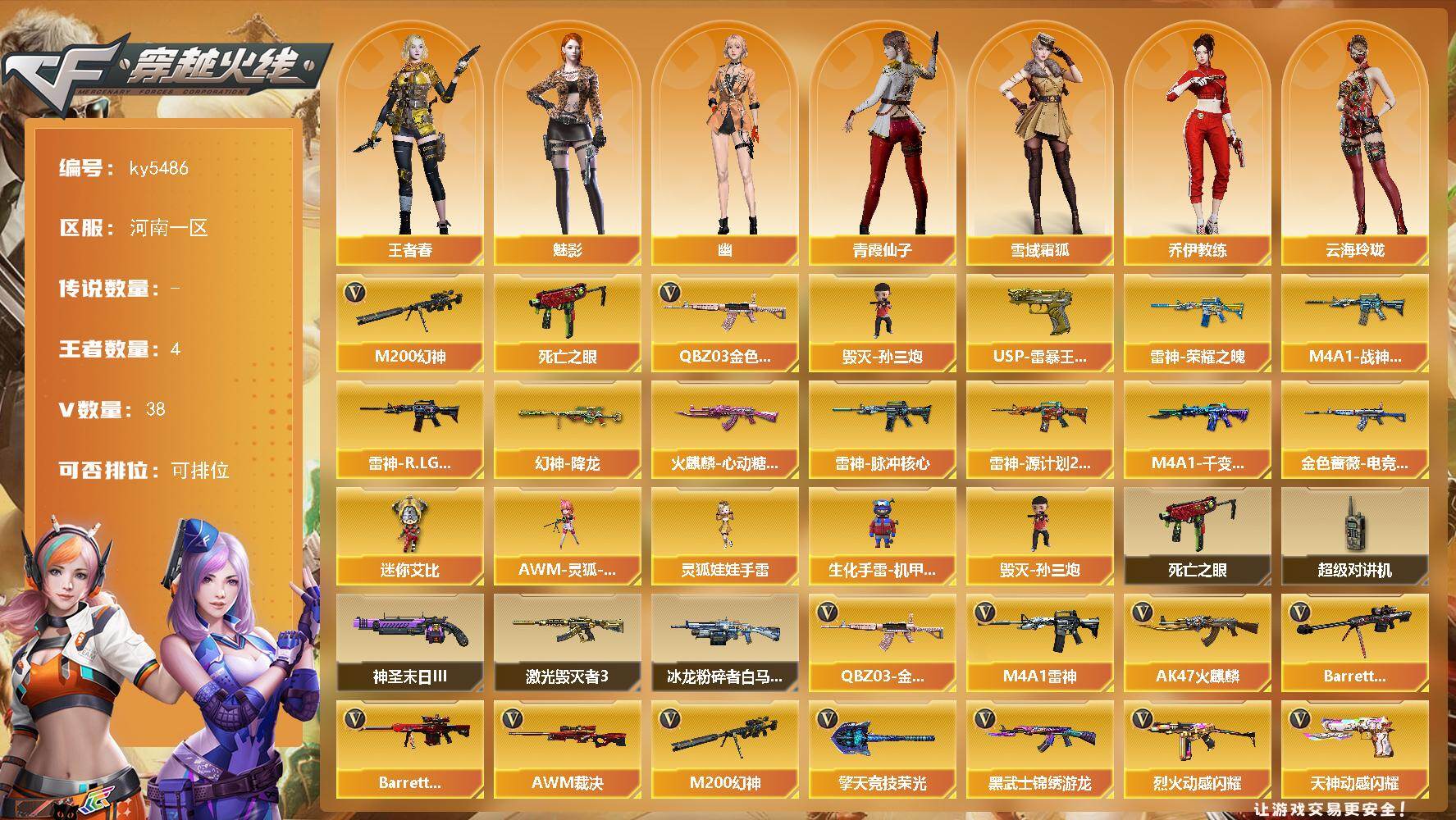 [16886417]河南一区-40V-4王者武器数-0炫金武器数 【热门武器】:QBZ03-金色蔷薇,M200-幻神,死亡之眼,毁灭-孙三炮 【王者炫金武器】:USP-雷暴王者 【皮肤】:幻神-降龙,金色蔷薇-电竞之星 皮肤,雷神-荣耀之魄,M4A1-战神赵云,雷神-R.LGD-CFPLS18冠军,雷神-脉冲核心,雷神-源计划2.0专属 皮肤,火麒麟-心动糖果,M4A1-千变-孔明皮肤 【角色】:魅影,王者春,雪域霜狐,乔伊教练,云海玲珑,暗夜-X,芳心审判者,飞虎队-X,风暴女,嘉年华灵狐,娟娟,灵狐者-X,曼陀罗-礼服,潘多拉-X,潘多拉-甜心教官,青霞仙子,斯沃特-X,兔囡囡,幽 【人偶武器】:毁灭-孙三炮,AWM-灵狐-15周年嘉年华,生化手雷-机甲核心,迷你艾比,灵狐娃娃手雷 【暴走生化】:死亡之眼,超级对讲机 【挑战大师】:冰龙粉碎者-白马银枪*2,激光毁灭者III,神圣爆裂者-末日III*2 【英雄级武器】:AK47-火麒麟,M4A1-雷神,黑武士-锦绣游龙,QBZ03-金色蔷薇,烈火-动感闪耀,AK47-B-战神,Barrett-毁灭,Barrett-极光,AWM-裁决,M200-幻神,天神-动感闪耀,擎天-竞技荣光,屠龙-动感闪耀,高爆手雷-竞技荣光*5,高爆手雷-神工天巧*2,手雷-动感闪耀,闪光弹-幻灵,闪光弹-竞技荣光*3,闪光弹-神工天巧,烟雾弹-竞技荣光*5 【道具】:亚洲杯纪念炫彩背包,全能枪王背包,冰冰企鹅背包,超级背包,绿色巨人,灵魂忍者*2,变异宝贝,迷雾幽灵*2,夺命之镰,防化服*2,金色流光-枪王排位*2,星辰流光-枪王排位,巅峰赛先锋-金色流光,枪王排位28赛季金色流光,枪王排位29赛季金色流光,动感闪耀表情,EP战队击杀图标,防弹头盔*2,防弹衣*3,C4工具钳*3,手雷包*3 【特殊枪械】:
