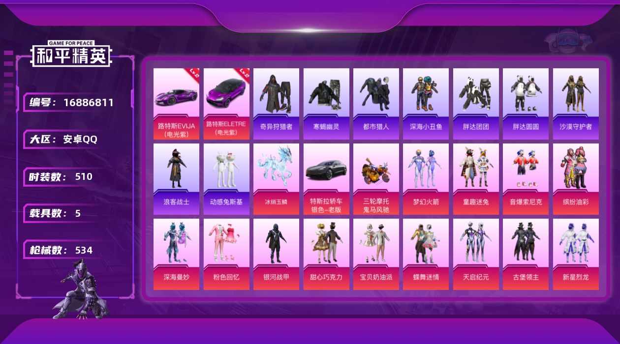 [16886811]安卓 手Q-54粉装-26特效枪-5载具-12粉色飞行器-240266热力值-22王牌印记-510套装-534枪皮
