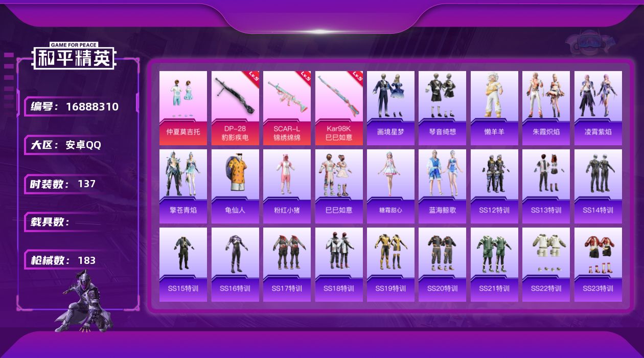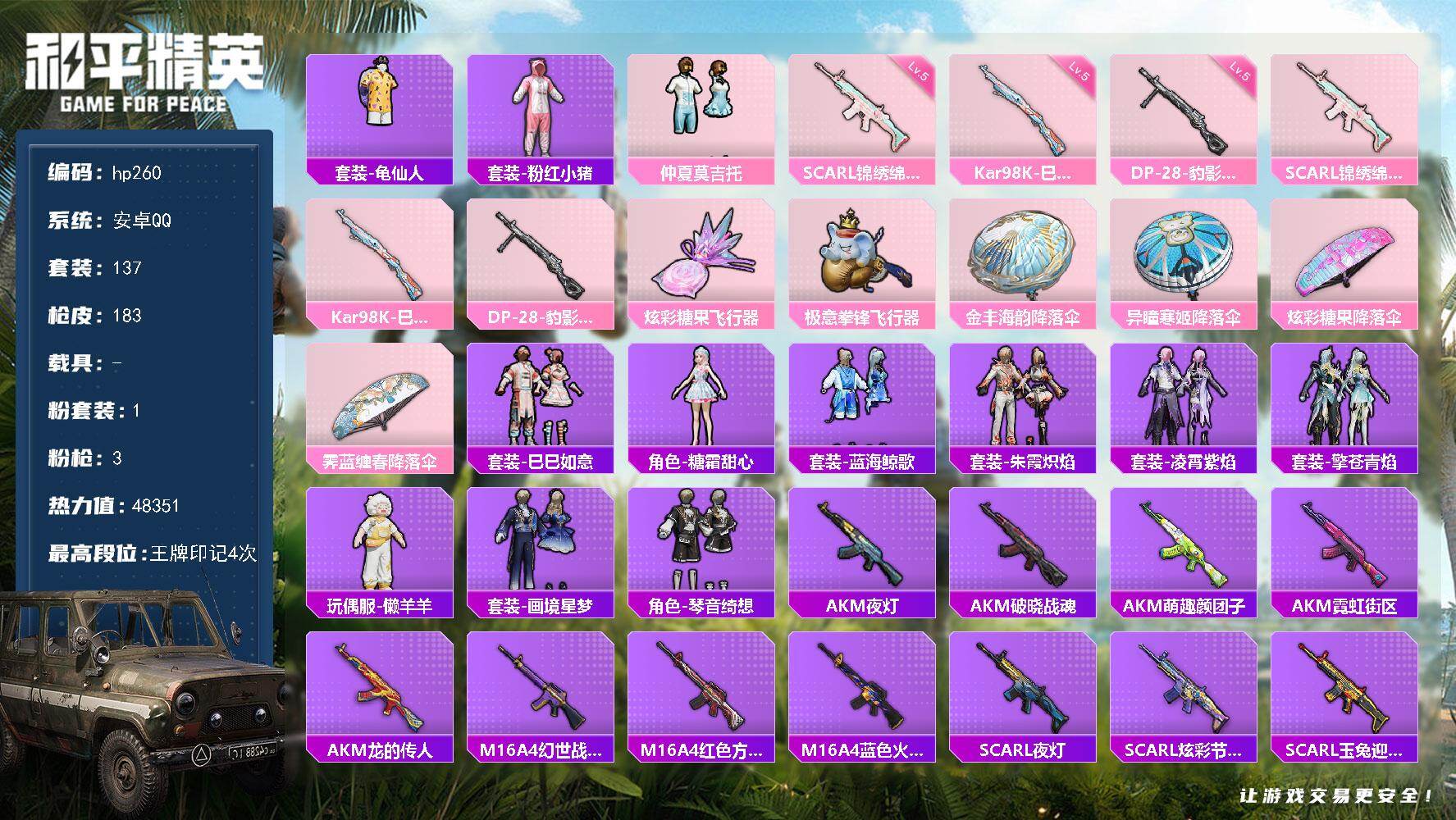 [16888310]安卓 手Q-1粉装-3特效枪-0载具-2粉色飞行器-48351热力值-4王牌印记-137套装-183枪皮 【热门品类】:套装-龟仙人,套装-粉红小猪 【粉色套装】:粉装-仲夏莫吉托 【粉色枪皮等级】:SCAR-L-锦绣绵绵(五级),Kar98K-巳巳如意(五级),DP-28-豹影疾电(五级) 【粉色枪皮】:SCAR-L-锦绣绵绵,Kar98K-巳巳如意,DP-28-豹影疾电 【粉色飞行器】:炫彩糖果飞行器,极意拳锋飞行器 【粉色降落伞】:金丰海韵降落伞,异瞳寒姬降落伞,炫彩糖果降落伞,霁蓝缠春降落伞 【稀有套装】:套装-龟仙人,套装-巳巳如意,套装-炫彩糖果,角色-糖霜甜心,套装-蓝海鲸歌,套装-朱霞炽焰,套装-凌霄紫焰,套装-擎苍青焰,玩偶服-懒羊羊,套装-画境星梦,套装-琴音绮想 【稀有枪皮】:AKM-夜灯,AKM-破晓战魂,AKM-萌趣颜团子,AKM-霓虹街区,AKM-龙的传人,M16A4-幻世战舞者,M16A4-红色方程式,M16A4-蓝色火焰,SCAR-L-夜灯,SCAR-L-炫彩节奏,SCAR-L-玉兔迎春,SCAR-L-红色方程式,M416-夜灯,M416-糯团青竹,M416-红色方程式,M416-绯红前夜,M416-蓝色火焰,GROZA-懵萌河马,GROZA-田园牧歌,GROZA-马卡龙,AUG-天降萌叽,AUG-耀粉歌者,AUG-闲梦青缨,QBZ-原初圣火,QBZ-彩虹符号,M762-天降萌叽,M762-牛气冲天,M762-第五大道,M762-绯红前夜,Mk47-妙红点点,G36C-懵萌河马,AC-VAL-天降萌叽,AC-VAL-彩虹甜喵,AC-VAL-快闪甜心,蜜獾-天降萌叽,蜜獾-娇憨猪猪,ACE32-画境星梦,ARX-凌霄紫焰,UZI-啾咪啾咪,UZI-娇憨猪猪,UZI-炫彩节奏,UZI-红色方程式,UMP45-仲夏莫吉托,UMP45-夜灯,UMP45-生命誓言,UMP45-蓝色火焰,Vector-彩虹符号,Vector-生命誓言,Vector-田园牧歌,Vector-香水柠檬,汤姆逊-天降萌叽,汤姆逊-耀粉歌者,野牛-夜灯,MP5K-怪笑疯兔,MP5K-画境星梦,JS9-凌霄紫焰,P90-快闪甜心,P90-飞驰魅影,P90-巳巳如意,Kar98K-彩虹符号,Kar98K-炫彩节奏,Kar98K-红色方程式,M24-炫彩节奏,M24-仲夏莫