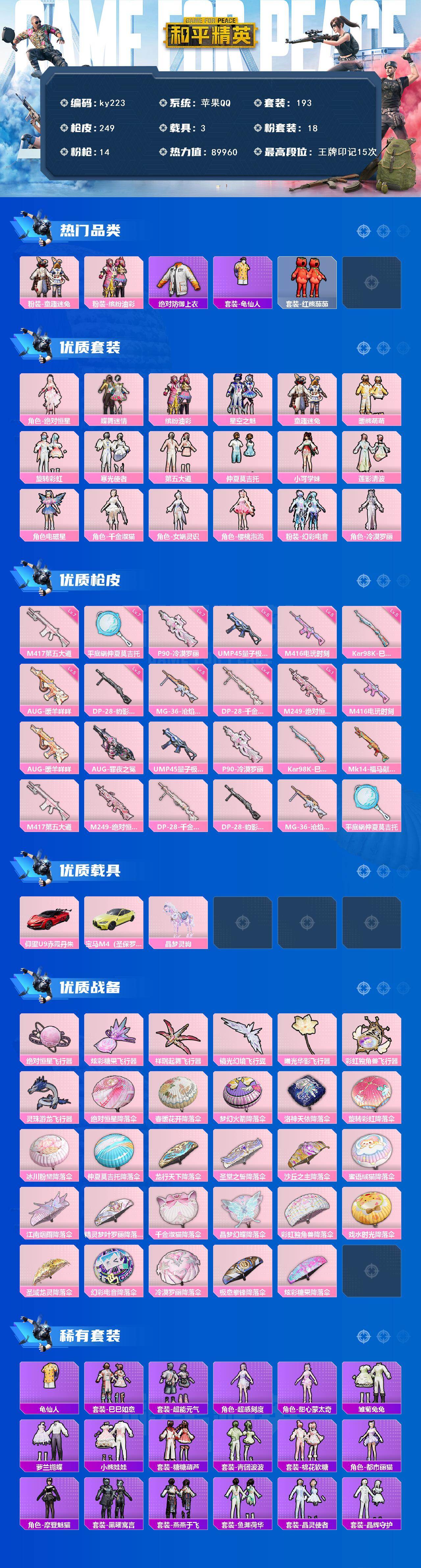 [16888985]苹果 手Q-18粉装-14特效枪-3载具-8粉色飞行器-89960热力值-15王牌印记-193套装-249枪皮 【热门品类】:粉装-童趣迷兔,粉装-缤纷油彩,绝对防御上衣,套装-龟仙人,套装-红熊茄茄 【粉色套装】:角色-绝对恒星,粉装-蝶舞迷情,粉装-缤纷油彩,粉装-星空之魅,粉装-童趣迷兔,粉装-暖熊萌萌,粉装-旋转彩虹,粉装-寒光使者,粉装-第五大道,粉装-仲夏莫吉托,角色-小可学妹,粉装-莲影清波,角色-电磁星,角色-千金淑猫,角色-女娲灵识,角色-樱桃泡泡,粉装-幻彩电音,角色-冷漠罗丽 【粉色枪皮等级】:M416-电玩时刻(五级),AUG-暖羊咩咩(五级),UMP45-量子极限(五级),P90-冷漠罗丽(七级),Kar98K-巳巳如意(五级),M417-第五大道(七级),M249-绝对恒星(一级),DP-28-千金淑猫(四级),DP-28-豹影疾电(五级),MG-36-沧焰双生(五级),平底锅-仲夏莫吉托(七级) 【粉色载具】:仰望U9(赤霞丹朱),宝马M4(圣保罗黄),晶梦灵驹 【粉色枪皮】:M416-电玩时刻,AUG-暖羊咩咩,AUG-罪夜之冕,UMP45-量子极限,P90-冷漠罗丽,Kar98K-巳巳如意,Mk14-福马献瑞,M417-第五大道,M249-绝对恒星,DP-28-千金淑猫,DP-28-豹影疾电,MG-36-沧焰双生,平底锅-仲夏莫吉托 【粉色飞行器】:绝对恒星飞行器,炫彩糖果飞行器,祥瑞起舞飞行器,镜光幻境飞行翼,曦光华影飞行器,彩虹独角兽飞行器,灵珠游龙飞行器 【粉色降落伞】:绝对恒星降落伞,春暖花开降落伞,梦幻火箭降落伞,洛神天依降落伞,旋转彩虹降落伞,冰川粉黛降落伞,仲夏莫吉托降落伞,龙行天下降落伞,圣堂之誓降落伞,沙丘之主降落伞,蜜语绒猫降落伞,江南烟雨降落伞,精灵梦叶罗丽降落伞,千金淑猫降落伞,晶梦幻蝶降落伞,彩虹独角兽降落伞,戏水时光降落伞,圣域龙灵降落伞,幻彩电音降落伞,冷漠罗丽降落伞,极意拳锋降落伞,炫彩糖果降落伞 【稀有套装】:套装-龟仙人,套装-巳巳如意,套装-超能元气,角色-超感刻度,角色-甜心蒙太奇,套装-雪国风尚,套装-炫彩糖果,套装-雏菊兔兔,套装-萝兰蝴蝶,套装-小熊娃娃,套装-糖糖葫芦,套装-青团波波,套装-棉花软糖,角色-都市丽猫,角色-摩登魅猫,套装-黑曜寓言,套装-燕燕于飞,套装-鱼渊荷华,套装