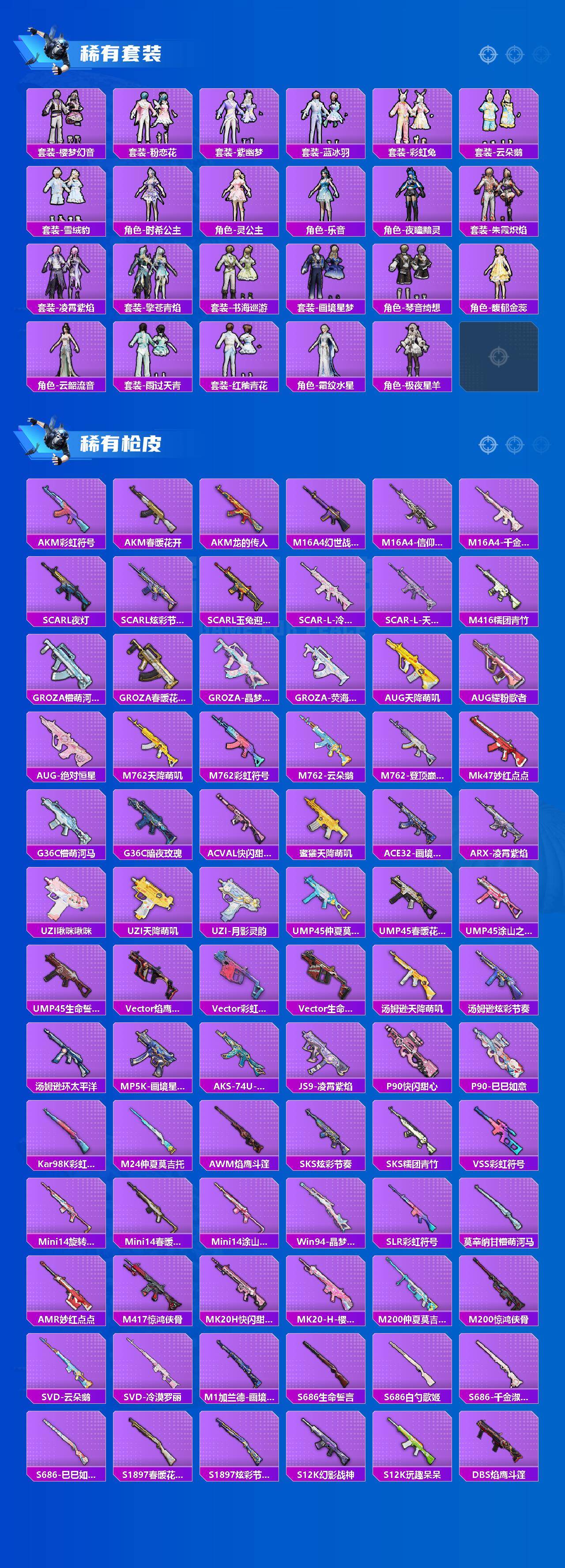 【粉色枪皮】:M416-电玩时刻,AUG-暖羊咩咩,AUG-罪夜之冕,UMP45-量子极限,P90-冷漠罗丽,Kar98K-巳巳如意,Mk14-福马献瑞,M417-第五大道,M249-绝对恒星,DP-28-千金淑猫,DP-28-豹影疾电,MG-36-沧焰双生,平底锅-仲夏莫吉托