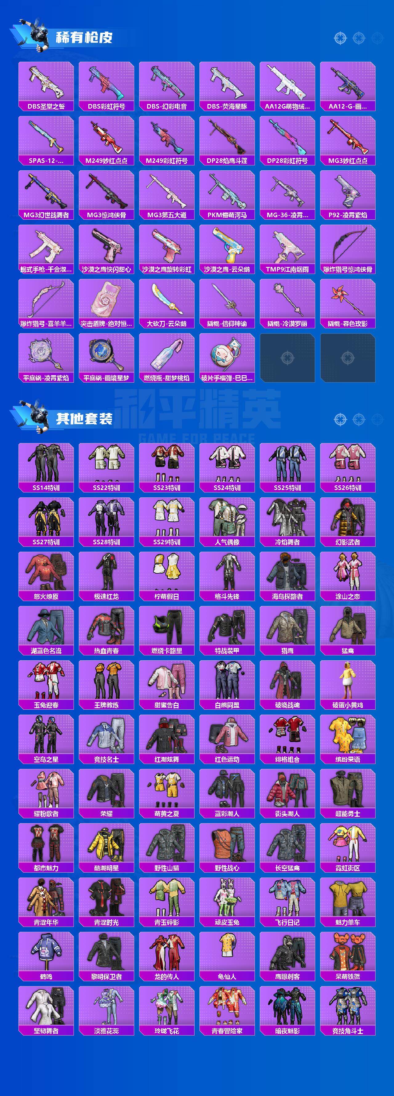 - [11529949]9粉装 8特效枪 16印记 可二次 可修改实名 身法装备:舞王派对(派对舞王、小金鞋) 优质装备:舞王派对(派对舞王、小金鞋),M416五爪金龙,奇异狩猎者,幻影战神,深渊皇后,M416风花雪月,七级M416-风花雪月,GROZA-镜光银凌,AUG-暖羊咩咩,智耀战神,AMR-智耀战神,MK14-甜梦熊击,时光之誓,羊梦糖心,Kar98K-巳巳如意 热门装扮:鸾凤武仙,未来歌姬,闲梦青缨,烟云彩露,派对舞王(小金鞋) 稀有枪皮:DP-28-豹影疾电 六级特效枪:六级AMR-智耀战神 五级特效枪:五级GROZA-镜光银凌,五级Kar98K-巳巳如意,五级DP-28-豹影疾电,五级MK14-甜梦熊击,五级AUG-暖羊咩咩 四级特效枪:四级M416-五爪金龙 紫色装扮:SS22特训,SS23特训,娇憨猪猪,暖心橘喵,萌趣咩咩,暖心熊熊,SS21特训,SS31特训套装,SS2特训,SS3特训,SS5特训,人气偶像,冰川特警,冷焰舞者,凛冬战士,北国孤狼,旭日情侣,极速光影,SS30特训套装,云朵鹅,彩虹兔,雪绒豹,SS33特训套装,青涩时光,顶瓜瓜,SS20特训,SS15特训,双棍侠客,时空追击者,暴风机械师,SS16特训,SS13特训,星梦畅游,SS14特训,萌趣颜团子,特种颜团子,SS19特训,英勇保护者,竞技角斗士,吉莉礼服,甜心亚梦,虚音幻奏,瑞龙福将,团圆交子,SS17特训,SS18特训,都市漫游者,都市魅力,酒红色名流,野性战心,野性战魂,金鼠迎春,长空猛禽,雪山征服者,雪山精英,霓虹街区,青年教官,迎春赐吉,风暴特警,缤纷果语,耀眼新星,荧惑魅影,蓝彩潮人,蓝色守护者,蓝色运动,虎虎生威吉莉,街头潮人,超能勇士,跃动心情,风行保卫者,骑行爱好者,魅力单车,鹤鸣,麻辣教官,黄色伏地魔,黄色名流,黄色运动,黎明保卫者,黑色伏地魔,龙的传人,龟仙人,冰河战士,龙魂突击队,蝶变,香桃花海,和平特警,极速红龙,柠萌假日,橘黑制服,沙漠兵团,沙漠雄狮,海岛探路者,涂山之恋,深蓝色名流,暗黑骑手,幻影武者,圣诞大吉,娴静芝兰,夏日音浪,夜莺强袭者,完美偶像,帅气教官,幻世战舞者,怒火燎原,战地督导,战地菁英,探宝勇士,湖蓝色名流,绮丽涂鸦,疯狂小兔子,白熊同盟,白色伏地魔,破晓战魂,破蛋小黄鸡,神秘领域,甜蜜告白,福星高照,空岛之星,突袭者,竞技勇士朋克,竞技达人朋克,红