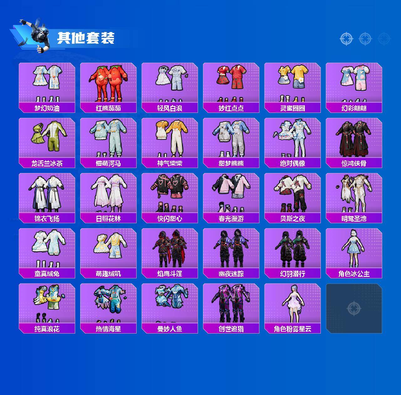 套装-缤纷油彩,套装-蝶舞迷情,套装-星空之魅,套装-暖熊萌萌,套装-旋转彩虹,套装-寒光使者,套装-第五大道,套装-仲夏莫吉托,角色-小可学妹,套装-莲影清波,角色-电磁星,角色-千金淑猫,角色-女娲灵识,角色-樱桃泡泡,套装-鹰眼刺客,套装-呆萌铁蟹
