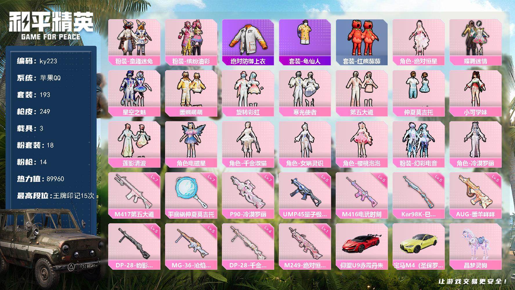 - [13964047]【暑期末清货/特价急出/永久包赔】:苹果 手Q-9粉装-5特效枪-4载具-4.6w热力值-2印记-79套装-107枪皮【稀有载具】:特斯拉Model X(珍珠白),玛莎拉蒂Ghibli(粉),玛莎拉蒂Ghibli(蓝),双人摩托-梦幻火箭【特效枪等级】:AKM-炫紫旋律(四级),SCAR-L-梦幻火箭(六级),M416-五爪金龙(七级),Kar98K-巳巳如意(一级),M24-星之信仰(六级)【优质套装】:粉装-守护骑士,粉装-快乐主宰,粉装-火曜朱雀,粉装-土曜战麒,粉装-雪国幻梦,粉装-蝶舞迷情,粉装-梦幻火箭,粉装-华贵君王,粉装-金风玉露【优质飞行器】:春暖花开飞行器,精灵迷巫飞行器,梦幻火箭飞行器,炫紫旋律飞行器