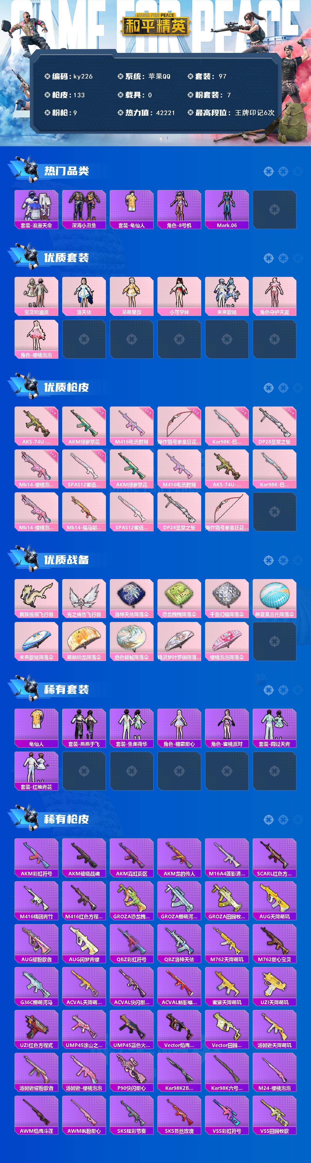 [16889207]苹果 手Q-7粉装-9特效枪-0载具-2粉色飞行器-42221热力值-6王牌印记-97套装-133枪皮 【热门品类】:套装-浪漫天命,套装-深海小丑鱼,套装-龟仙人,角色-8号机,角色-Mark.06 【粉色套装】:粉装-宝贝奶油派,角色-洛天依,角色-呆萌星弥,角色-小可学妹,粉装-未来歌姬,角色-守护天翼,角色-樱桃泡泡 【粉色枪皮等级】:AKM-绿萝繁花(五级),M416-电玩时刻(五级),AKS-74U-森灵之息(四级),Kar98K-巳巳如意(五级),Mk14-樱桃泡泡(二级),SPAS-12-蜜语绒猫(一级),DP-28-圣堂之誓(四级),爆炸猎弓-拳皇·狂花道(五级) 【粉色枪皮】:AKM-绿萝繁花,M416-电玩时刻,AKS-74U-森灵之息,Kar98K-巳巳如意,Mk14-樱桃泡泡,Mk14-福马献瑞,SPAS-12-蜜语绒猫,DP-28-圣堂之誓,爆炸猎弓-拳皇·狂花道 【粉色飞行器】:黄族统领飞行器,光之祷告飞行器 【粉色降落伞】:洛神天依降落伞,恐龙拽拽降落伞,千面幻镜降落伞,仲夏莫吉托降落伞,未来歌姬降落伞,萌酷奶龙降落伞,绝色倾城降落伞,精灵梦叶罗丽降落伞,樱桃泡泡降落伞 【稀有套装】:套装-龟仙人,套装-燕燕于飞,套装-鱼渊荷华,角色-糖霜甜心,角色-蜜桃派对,套装-雨过天青,套装-红釉青花 【稀有枪皮】:AKM-彩虹符号,AKM-破晓战魂,AKM-霓虹街区,AKM-龙的传人,M16A4-莲影清波,SCAR-L-红色方程式,M416-糯团青竹,M416-红色方程式,GROZA-恐龙拽拽,GROZA-懵萌河马,GROZA-田园牧歌,AUG-天降萌叽,AUG-耀粉歌者,AUG-闲梦青缨,QBZ-彩虹符号,QBZ-洛神天依,M762-天降萌叽,M762-甜心宝贝,G36C-懵萌河马,AC-VAL-天降萌叽,AC-VAL-快闪甜心,AC-VAL-魅影蝠王,蜜獾-天降萌叽,UZI-天降萌叽,UZI-红色方程式,UMP45-涂山之恋,UMP45-蓝色火焰,Vector-焰鹰斗篷,Vector-田园牧歌,汤姆逊-天降萌叽,汤姆逊-耀粉歌者,汤姆逊-樱桃泡泡,P90-快闪甜心,Kar98K-2B战斗服款,Kar98K-六号树人,M24-樱桃泡泡,AWM-焰鹰斗篷,AWM-飒粉甜心,SKS-炫彩节奏,SKS-苔丝玫瑰,VSS-彩虹符号,VSS-田园牧