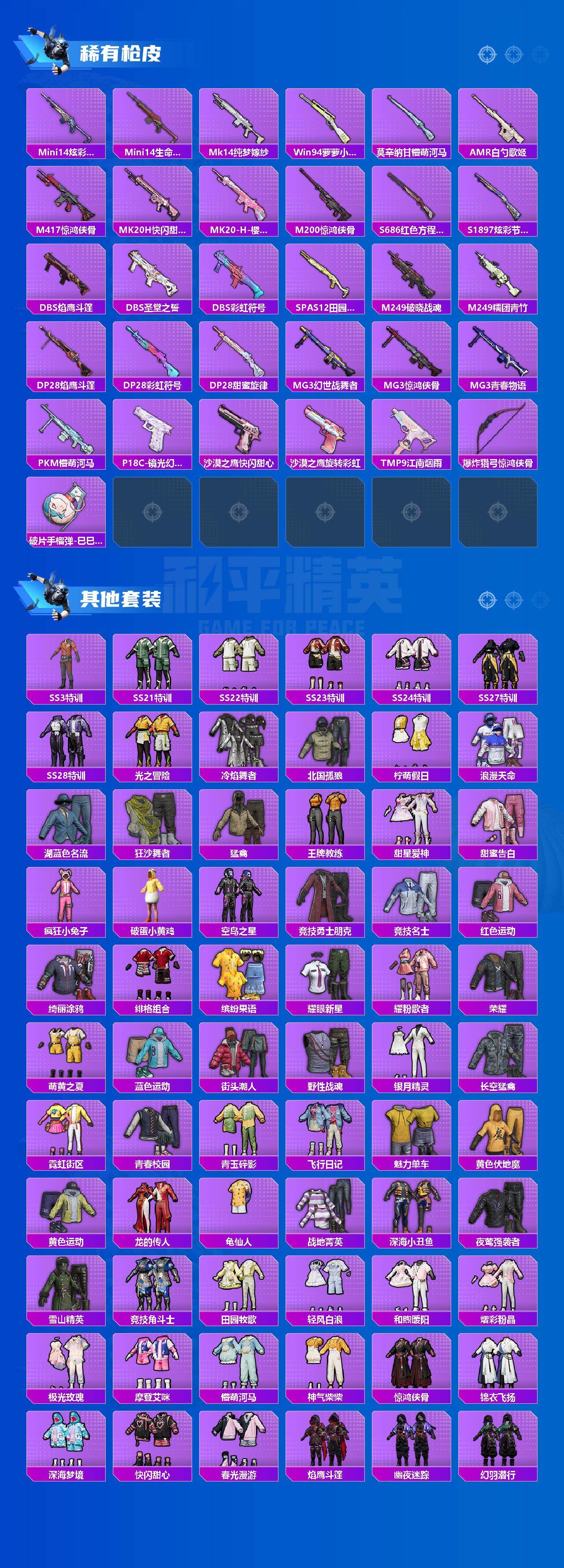 【稀有枪皮】:AKM-彩虹符号,AKM-破晓战魂,AKM-霓虹街区,AKM-龙的传人,M16A4-莲影清波,SCAR-L-红色方程式,M416-糯团青竹,M416-红色方程式,GROZA-恐龙拽拽,GROZA-懵萌河马,GROZA-田园牧歌,AUG-天降萌叽,AUG-耀粉歌者,AUG-闲梦青缨,QBZ-彩虹符号,QBZ-洛神天依,M762-天降萌叽,M762-甜心宝贝,G36C-懵萌河马,AC-VAL-天降萌叽,AC-VAL-快闪甜心,AC-VAL-魅影蝠王,蜜獾-天降萌叽,UZI-天降萌叽,UZI-红色方程式,UMP45-涂山之恋,UMP45-蓝色火焰,Vector-焰鹰斗篷,Vector-田园牧歌,汤姆逊-天降萌叽,汤姆逊-耀粉歌者,汤姆逊-樱桃泡泡,P90-快闪甜心,Kar98K-2B战斗服款,Kar98K-六号树人,M24-樱桃泡泡,AWM-焰鹰斗篷,AWM-飒粉甜心,SKS-炫彩节奏,SKS-苔丝玫瑰,VSS-彩虹符号,VSS-田园牧
