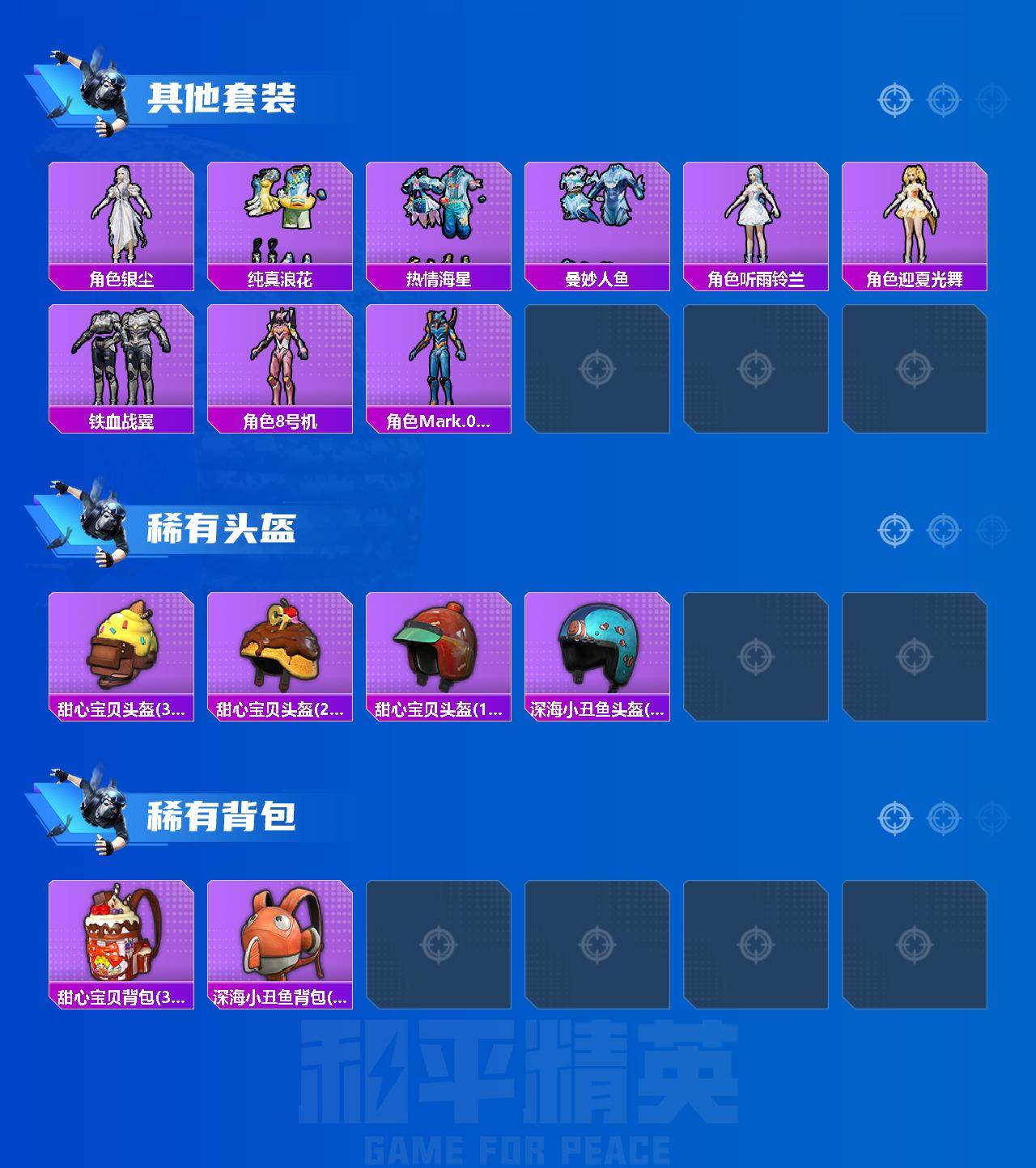 【稀有套装】:套装-龟仙人,套装-燕燕于飞,套装-鱼渊荷华,角色-糖霜甜心,角色-蜜桃派对,套装-雨过天青,套装-红釉青花