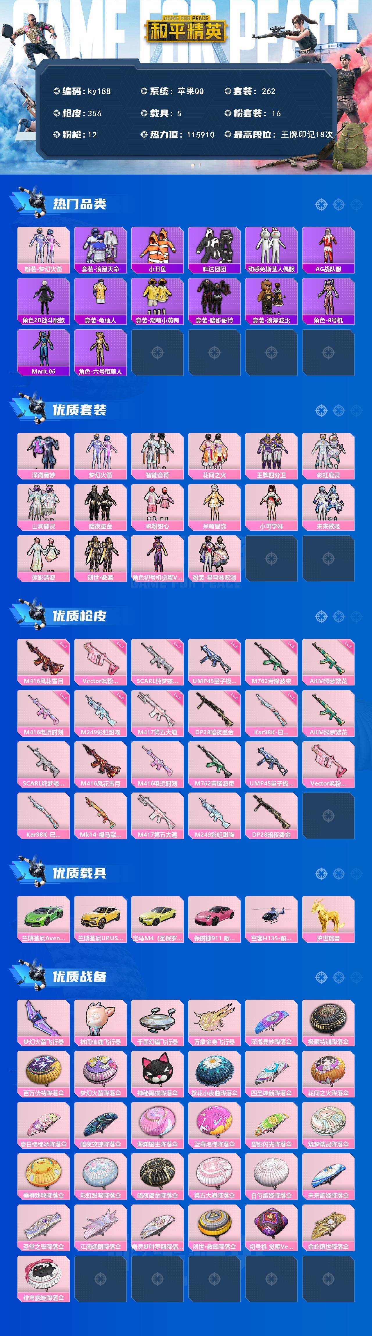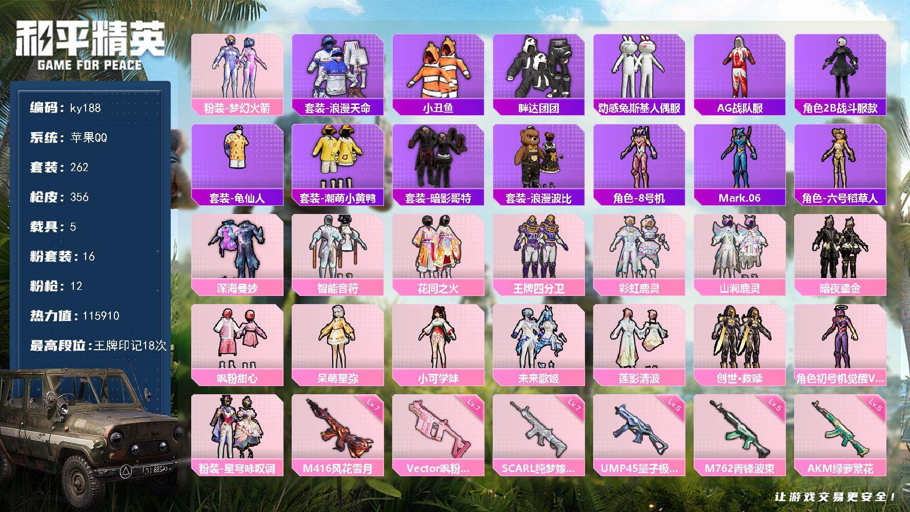 [16889970]苹果 手Q-16粉装-12特效枪-5载具-4粉色飞行器-115910热力值-18王牌印记-262套装-356枪皮