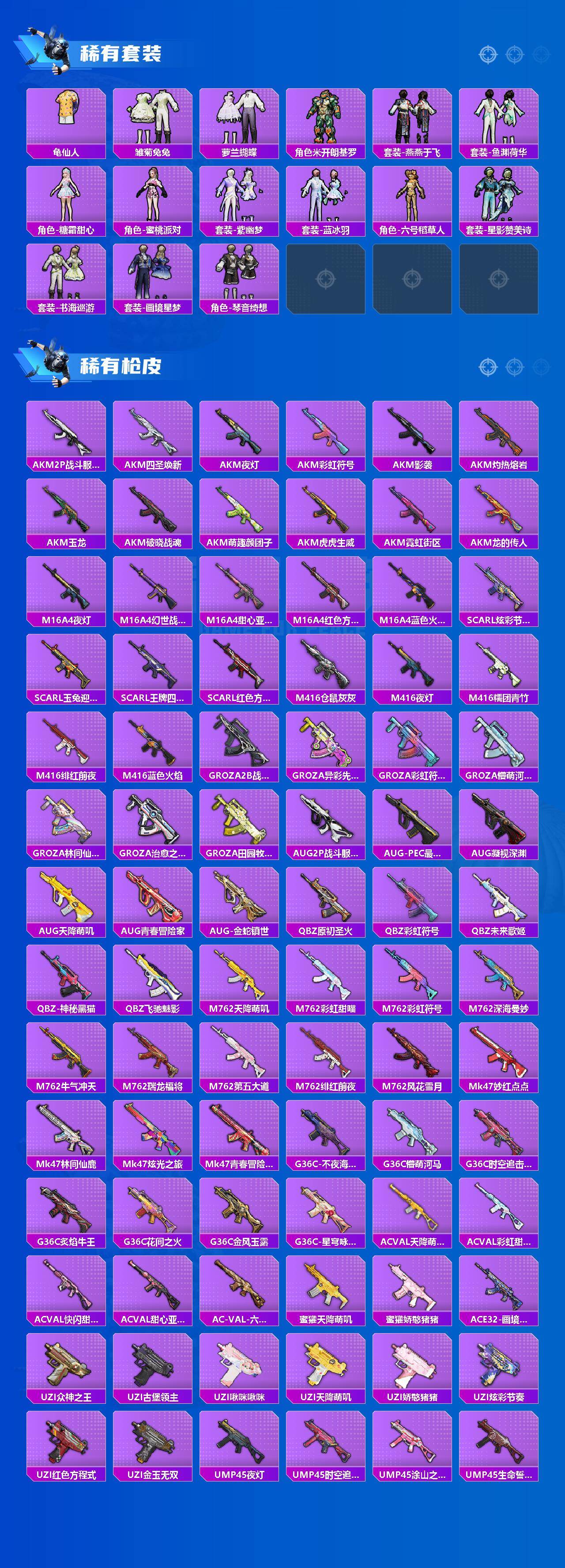 M416-仓鼠灰灰,GROZA-林间仙鹿,AUG-PEC最牛战神,M762-瑞龙福将,M762-风花雪月,Mk47-林间仙鹿,汤姆逊-林间仙鹿,Kar98K-深海曼妙,Mini14-林间仙鹿