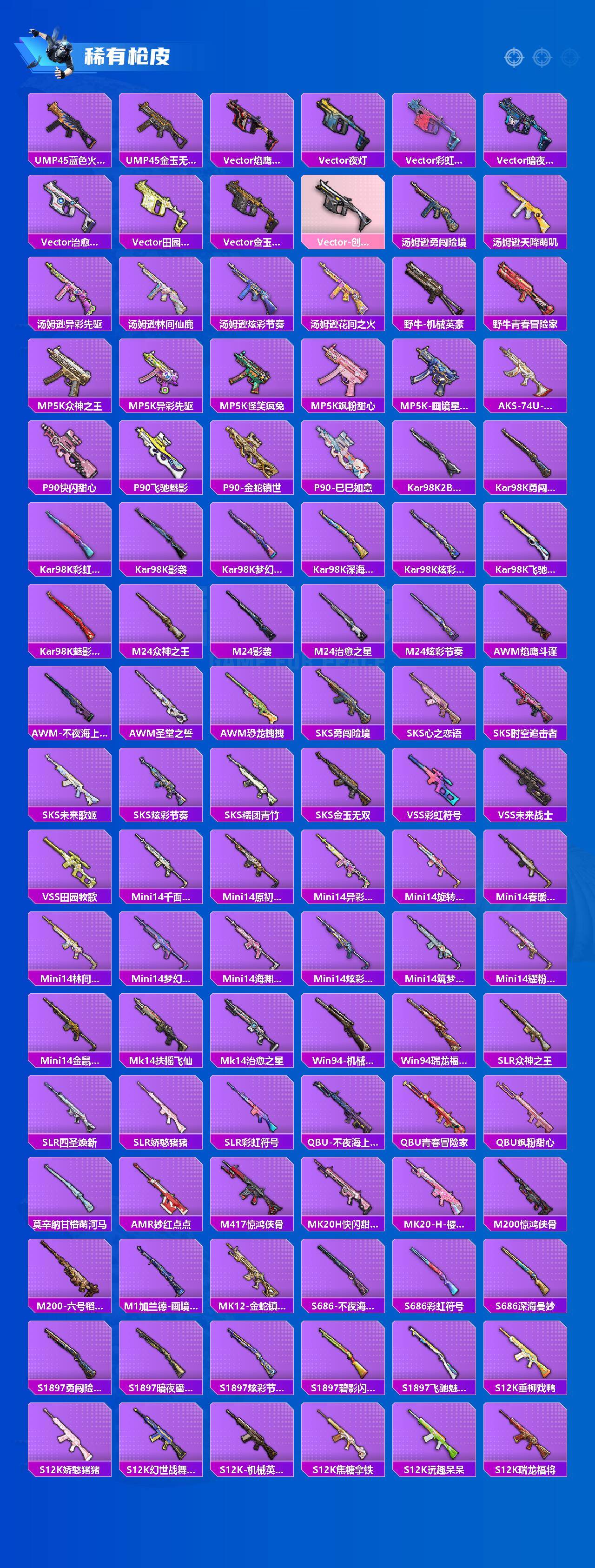 AKM-绿萝繁花,SCAR-L-纯梦嫁纱,M416-风花雪月,M416-电玩时刻,M762-青锋波束,UMP45-量子极限,Vector-飒粉甜心,Kar98K-巳巳如意,M417-第五大道,M249-彩虹甜喵,DP-28-暗夜鎏金