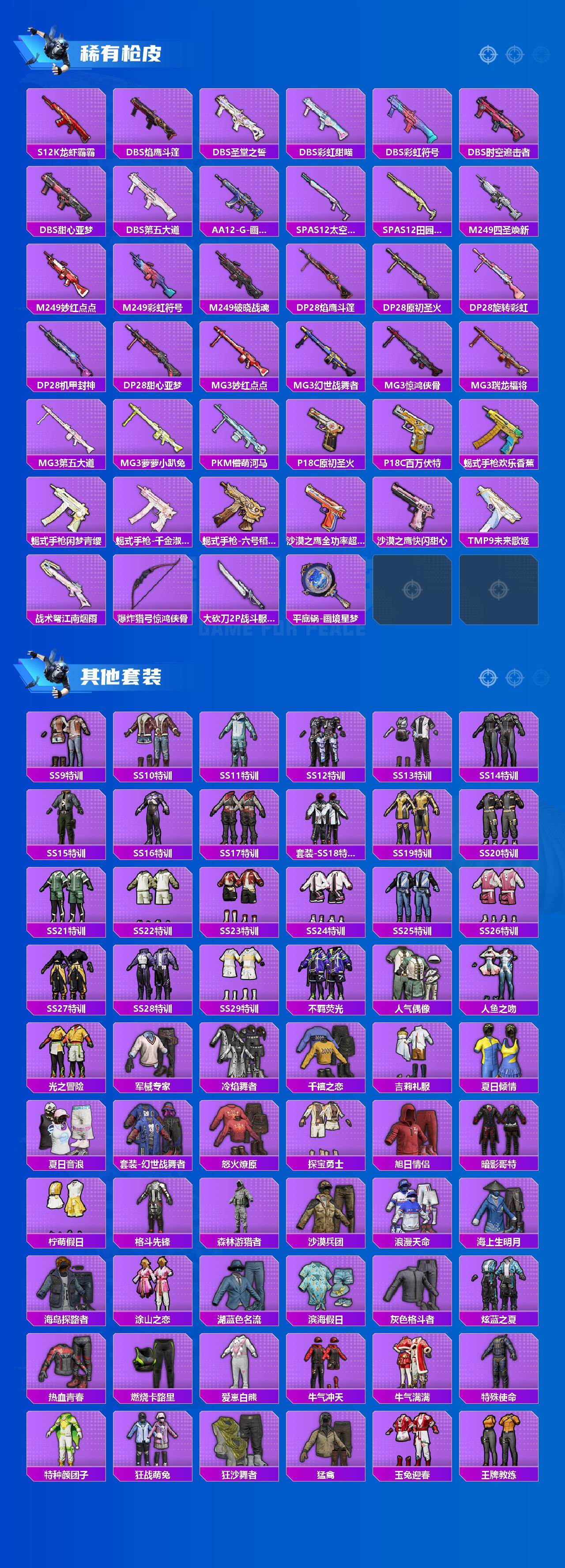 [16889970]苹果 手Q-16粉装-12特效枪-5载具-4粉色飞行器-115910热力值-18王牌印记-262套装-356枪皮 【热门品类】:粉装-梦幻火箭,套装-浪漫天命,套装-小丑鱼,套装-胖达团团,套装-动感兔斯基人偶服,套装-AG战队服,角色-2B战斗服款,套装-龟仙人,套装-潮萌小黄鸭,套装-暗影哥特,套装-浪漫波比,角色-8号机,角色-Mark.06,角色-六号稻草人 【粉色套装】:粉装-深海曼妙,粉装-梦幻火箭,粉装-智能音符,粉装-花间之火,粉装-王牌四分卫,粉装-彩虹鹿灵,粉装-山涧鹿灵,粉装-暗夜鎏金,粉装-飒粉甜心,角色-呆萌星弥,角色-小可学妹,粉装-未来歌姬,粉装-莲影清波,套装-创世·救赎,角色-初号机 觉醒Ver.,粉装-星穹咏叹调 【粉色枪皮等级】:AKM-绿萝繁花(五级),SCAR-L-纯梦嫁纱(七级),M416-风花雪月(七级),M416-电玩时刻(五级),M762-青锋波束(五级),UMP45-量子极限(五级),Vector-飒粉甜心(七级),Kar98K-巳巳如意(五级),M417-第五大道(五级),M249-彩虹甜喵(五级),DP-28-暗夜鎏金(五级) 【粉色载具】:兰博基尼Aventador SVJ(翡翠绿),兰博基尼URUS(明艳黄),宝马M4(圣保罗黄),保时捷911 敞篷版(星珀红),空客H135-蔚蓝之翼,护世瑞兽 【粉色枪皮】:AKM-绿萝繁花,SCAR-L-纯梦嫁纱,M416-风花雪月,M416-电玩时刻,M762-青锋波束,UMP45-量子极限,Vector-飒粉甜心,Kar98K-巳巳如意,Mk14-福马献瑞,M417-第五大道,M249-彩虹甜喵,DP-28-暗夜鎏金 【粉色飞行器】:梦幻火箭飞行器,林间仙鹿飞行器,千面幻镜飞行器,万象金身飞行器 【粉色降落伞】:深海曼妙降落伞,极限特训降落伞,百万伏特降落伞,梦幻火箭降落伞,神秘黑猫降落伞,繁花小夜曲降落伞,四圣焕新降落伞,花间之火降落伞,夏日绵绵冰降落伞,暗夜玫瑰降落伞,海渊国主降落伞,蓝莓炮弹降落伞,碧影闪光降落伞,筑梦精灵降落伞,垂柳戏鸭降落伞,彩虹甜喵降落伞,暗夜鎏金降落伞,第五大道降落伞,白勺歌姬降落伞,未来歌姬降落伞,圣堂之誓降落伞,江南烟雨降落伞,精灵梦叶罗丽降落伞,创世·救赎降落伞,初号机 觉醒Ver.降落伞,金蛇镇世降落伞,绯穹魔姬降落伞 【稀有