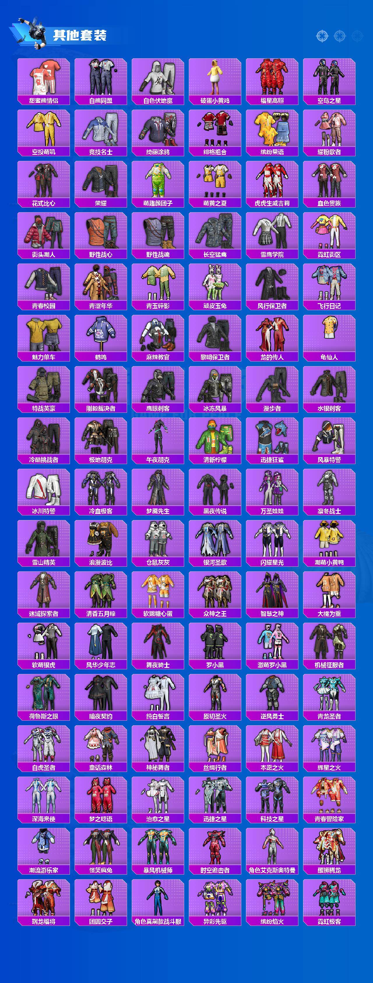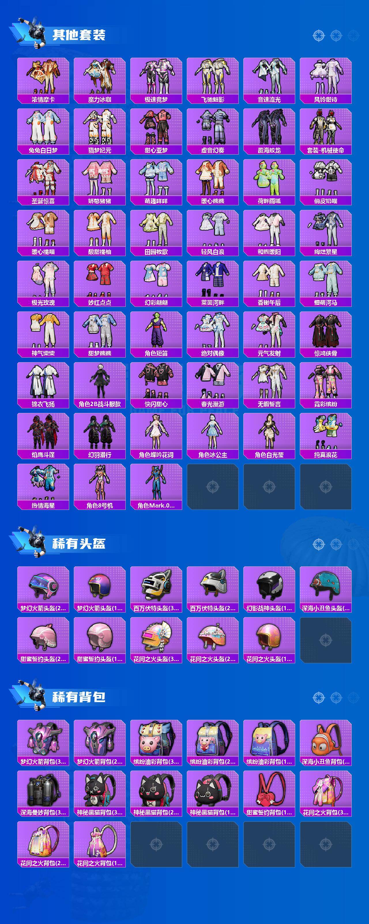 套装-梦幻火箭,套装-胖达团团,套装-潮萌小黄鸭,套装-浪漫波比,套装-深海曼妙,套装-智能音符,套装-花间之火,套装-王牌四分卫,套装-彩虹鹿灵,套装-山涧鹿灵,套装-暗夜鎏金,套装-飒粉甜心,角色-呆萌星弥,角色-小可学妹,套装-未来歌姬,套装-莲影清波,套装-创世·救赎,角色-觉醒初号机,套装-爱崽白熊,套装-鹰眼刺客,套装-迅捷狂鲨,套装-梦魇先生,套装-万圣娃娃,套装-仓鼠灰灰,套装-大橘为重,套装-软萌银虎,套装-罗小黑,兔兔白日梦套装