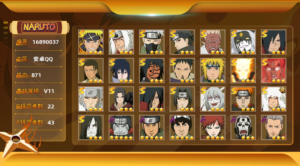 [16890037]22S级忍者数-43A级忍者数 【S级忍者】:千手扉间「秽土转生」(3星),宇智波鼬「秽土转生」(3星),宇智波斑「秽土转生」(3星),宇智波斑「秽土转生·解」(3星),宇智波带土「忍界大战」(3星),艾「忍界大战」(3星),宇智波鼬「须佐能乎」(3星),宇智波止水「须佐能乎」(3星),旗木卡卡西「须佐能乎」(3星),千手柱间「木叶创立」(3星),自来也「舞之豪杰」(3星),大蛇丸(3星),自来也「传说中的三忍」(3星),波风水门(3星),药师兜「仙人模式」(3星),神秘面具男「红夜之刃」(3星),漩涡鸣人「九喇嘛连结」(3星),迈特凯「死门」(3星),佩恩「天道」(3星),宇智波佐助「永恒万花筒」(3星),大筒木桃式(3星),漩涡鸣人·宇智波佐助(3星) 【A级忍者】:艾「青年」(2星),长门「青年」(2星),波风水门「青年」(2星),达鲁伊「博人传」(2星),迪达拉(2星),迪达拉「秽土转生」(2星),大蛇丸「晓」(2星),奇拉比(2星),飞段(3星),飞段「死司凭血」(3星),干柿鬼鲛(5星),漩涡博人「桃式显现」(2星),漩涡鸣人「九尾查克拉」(2星),迈特凯(5星),旗木卡卡西「忍界大战」(2星),旗木卡卡西「幻之真容」(2星),我爱罗「疾风传」(4星),我爱罗「新春限定」(2星),蝎(3星),蝎「绯流琥」(2星),角都「秽土转生」(2星),猿飞阿斯玛(5星),宇智波鼬(2星),宇智波佐助「须佐能乎」(2星),宇智波佐助「万花筒写轮眼」(2星),宇智波佐助「侠隐江湖」(2星),药师兜「侠隐江湖」(2星),日向宁次「忍界大战」(2星),日向雏田「最终章」(2星),黑绝(2星),宇智波带土「漂泊浪客」(2星),长十郎「六代目水影」(2星),神秘面具男「忍者之路」(2星),佩恩·六道「漂泊浪客」(2星),李洛克「忍界大战」(2星),黑土「博人传」(2星),秋道丁次「忍界大战」(2星),千代「近松十人卫」(2星),土台「忍界大战」(2星),不缘(2星),不风(2星),宇智波泉奈(2星),迈特凯「青春爆炸」(2星)