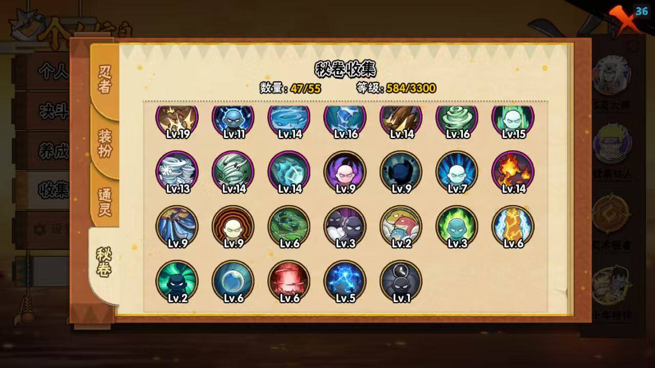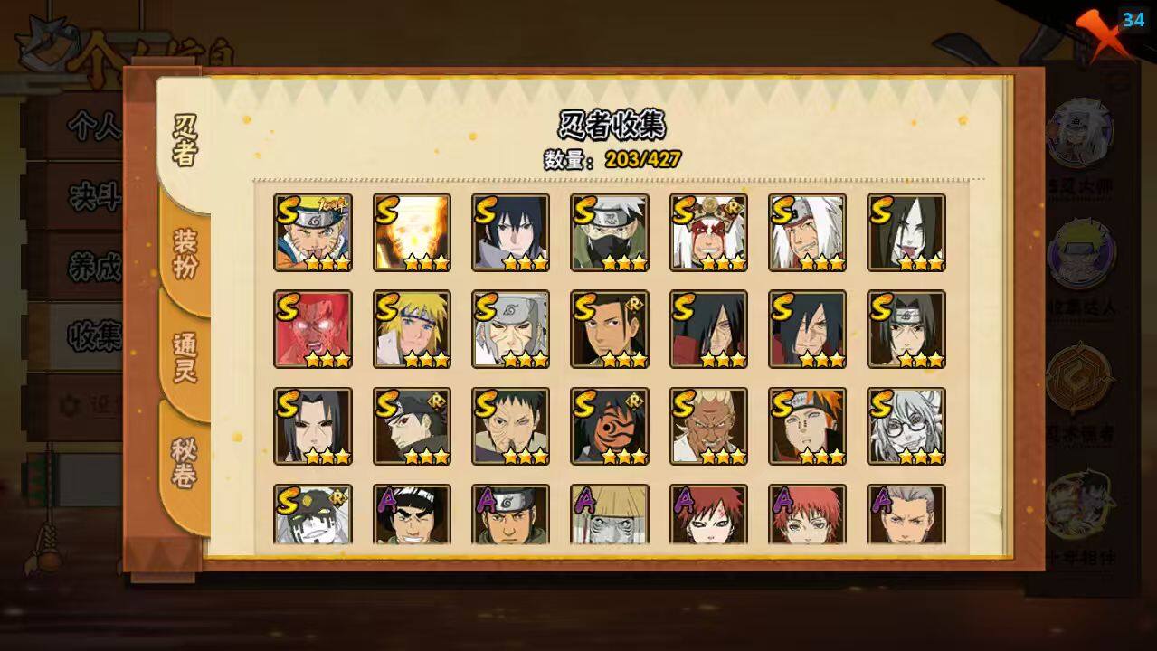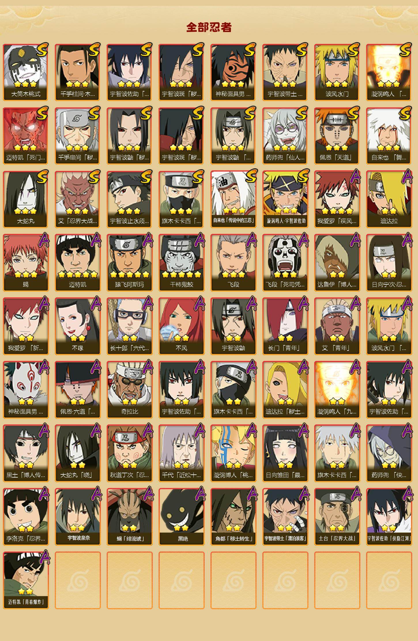 【S级忍者】:千手扉间「秽土转生」(3星),宇智波鼬「秽土转生」(3星),宇智波斑「秽土转生」(3星),宇智波斑「秽土转生·解」(3星),宇智波带土「忍界大战」(3星),艾「忍界大战」(3星),宇智波鼬「须佐能乎」(3星),宇智波止水「须佐能乎」(3星),旗木卡卡西「须佐能乎」(3星),千手柱间「木叶创立」(3星),自来也「舞之豪杰」(3星),大蛇丸(3星),自来也「传说中的三忍」(3星),波风水门(3星),药师兜「仙人模式」(3星),神秘面具男「红夜之刃」(3星),漩涡鸣人「九喇嘛连结」(3星),迈特凯「死门」(3星),佩恩「天道」(3星),宇智波佐助「永恒万花筒」(3星),大筒木桃式(3星),漩涡鸣人·宇智波佐助(3星)
