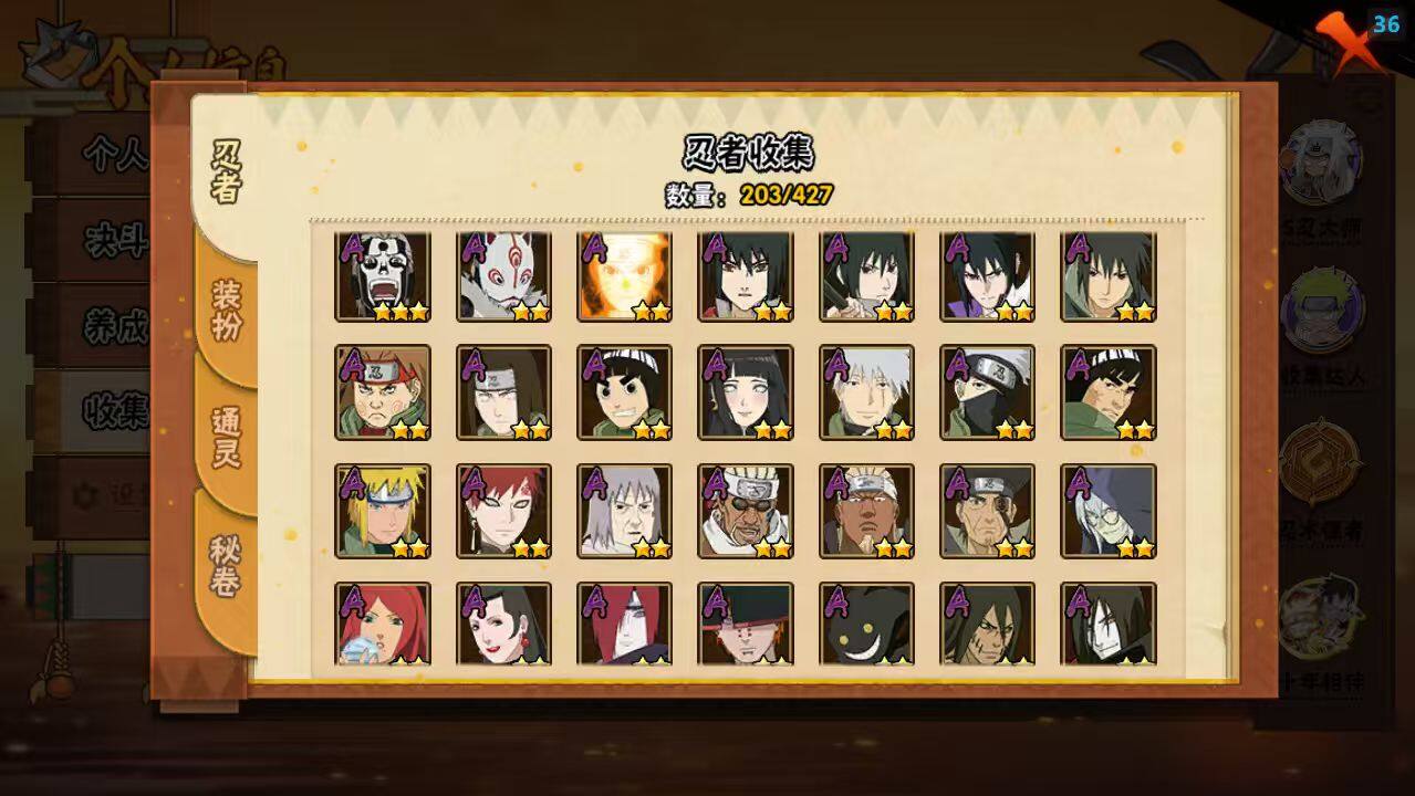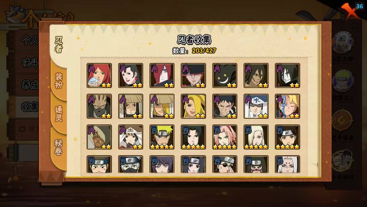 【A级忍者】:艾「青年」(2星),长门「青年」(2星),波风水门「青年」(2星),达鲁伊「博人传」(2星),迪达拉(2星),迪达拉「秽土转生」(2星),大蛇丸「晓」(2星),奇拉比(2星),飞段(3星),飞段「死司凭血」(3星),干柿鬼鲛(5星),漩涡博人「桃式显现」(2星),漩涡鸣人「九尾查克拉」(2星),迈特凯(5星),旗木卡卡西「忍界大战」(2星),旗木卡卡西「幻之真容」(2星),我爱罗「疾风传」(4星),我爱罗「新春限定」(2星),蝎(3星),蝎「绯流琥」(2星),角都「秽土转生」(2星),猿飞阿斯玛(5星),宇智波鼬(2星),宇智波佐助「须佐能乎」(2星),宇智波佐助「万花筒写轮眼」(2星),宇智波佐助「侠隐江湖」(2星),药师兜「侠隐江湖」(2星),日向宁次「忍界大战」(2星),日向雏田「最终章」(2星),黑绝(2星),宇智波带土「漂泊浪客」(2星),长十郎「六代目水影」(2星),神秘面具男「忍者之路」(2星),佩恩·六道「漂泊浪客」(2星),李洛克「忍界大战」(2星),黑土「博人传」(2星),秋道丁次「忍界大战」(2星),千代「近松十人卫」(2星),土台「忍界大战」(2星),不缘(2星),不风(2星),宇智波泉奈(2星),迈特凯「青春爆炸」(2星)