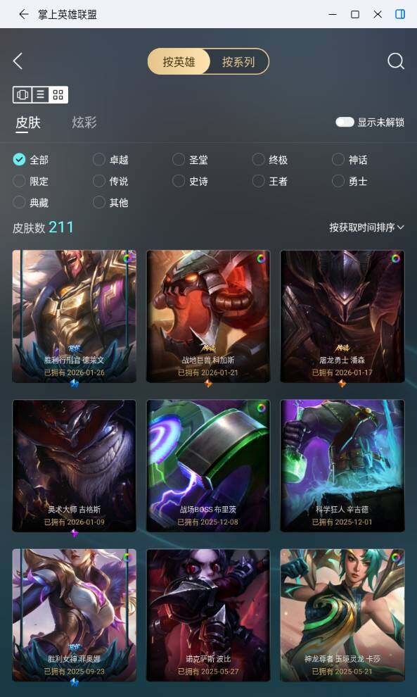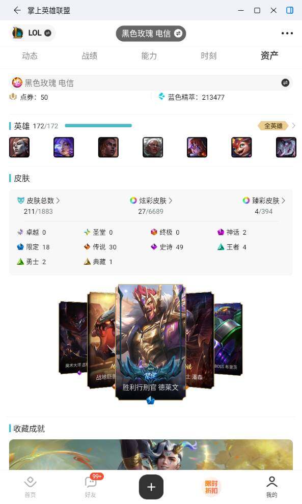 [16891045]黄金段位-172英雄-211皮肤-27炫彩-0终极-2神话-18限定-30传说-49史诗