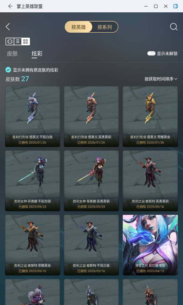 【限定皮肤】:冠军之隐劫,暗杀星蒙多,胜利之剑亚托克斯,胜利枪神卢锡安,胜利凤凰艾尼维亚,胜利之王泰达米尔,胜利巨口克格莫,胜利女神娑娜,胜利剑圣易,胜利之运崔斯特,胜利女神菲奥娜,密林猎手提莫,暗影沃里克,都铎王朝图奇,防暴天使凯尔