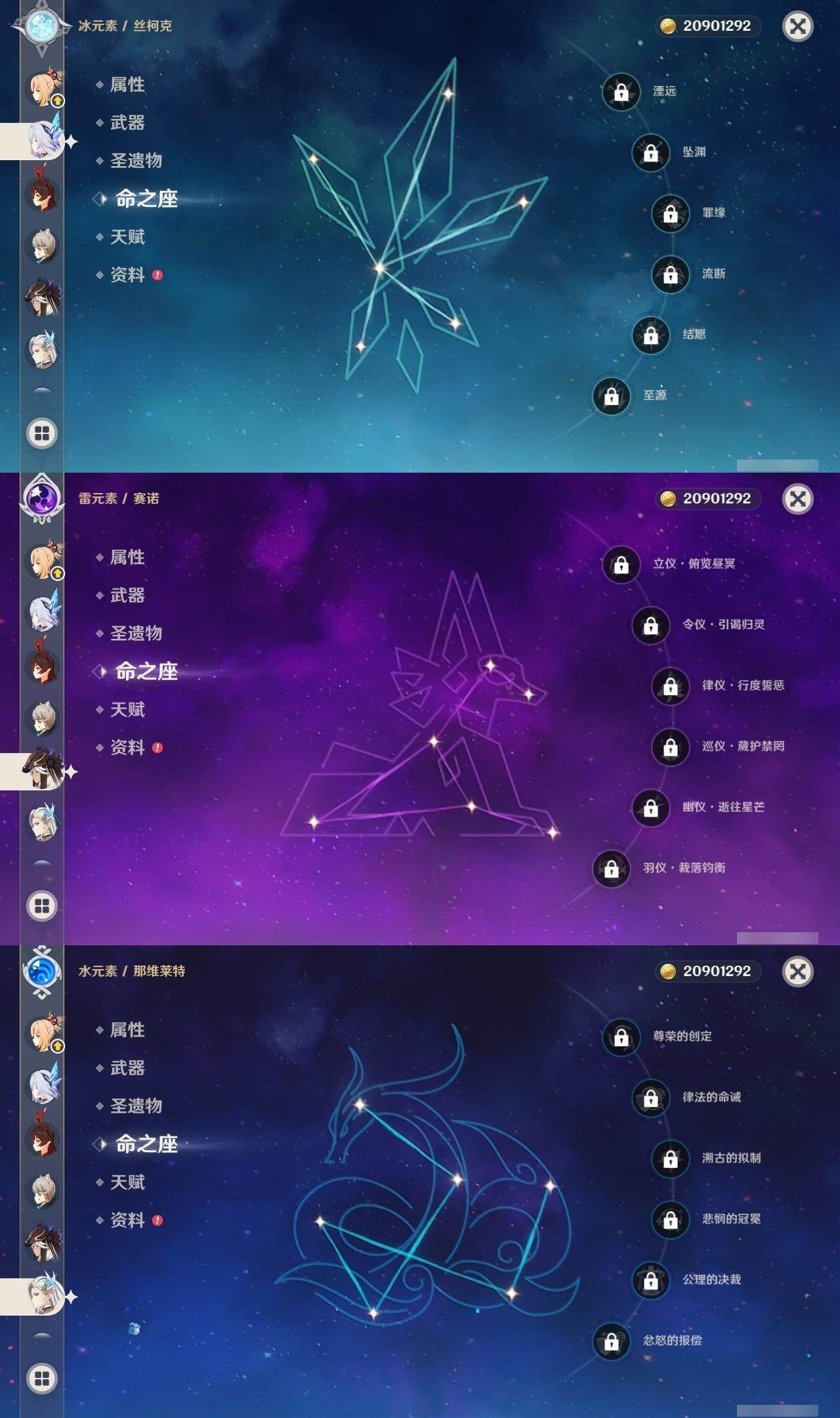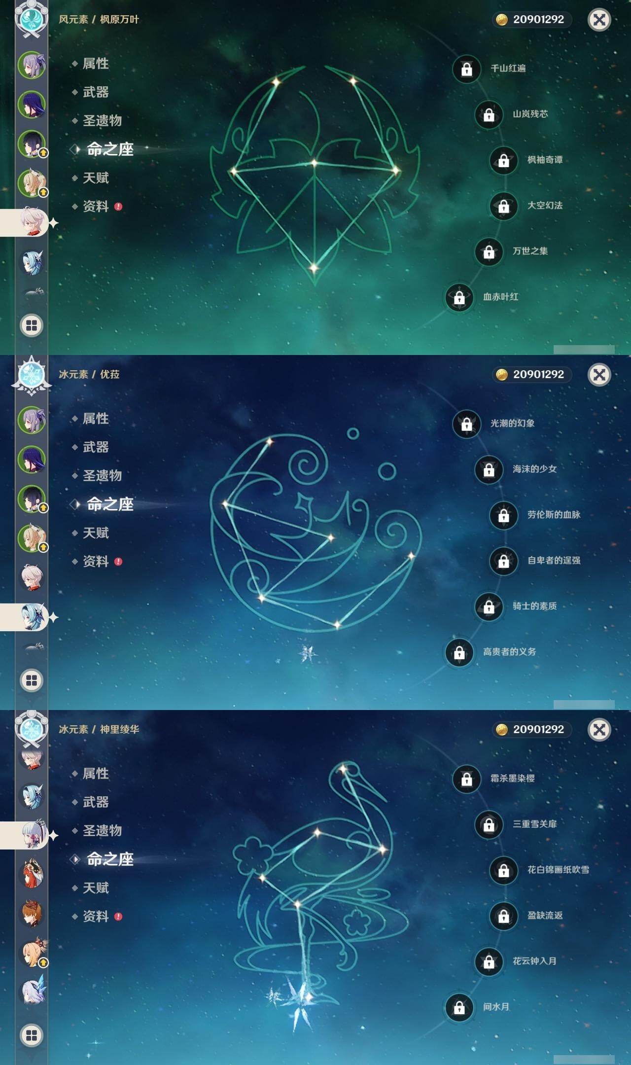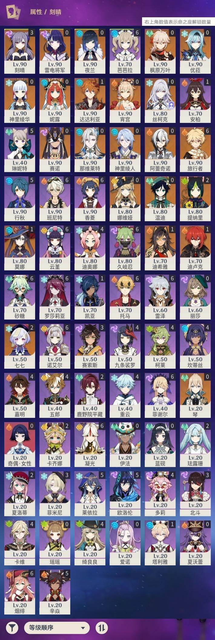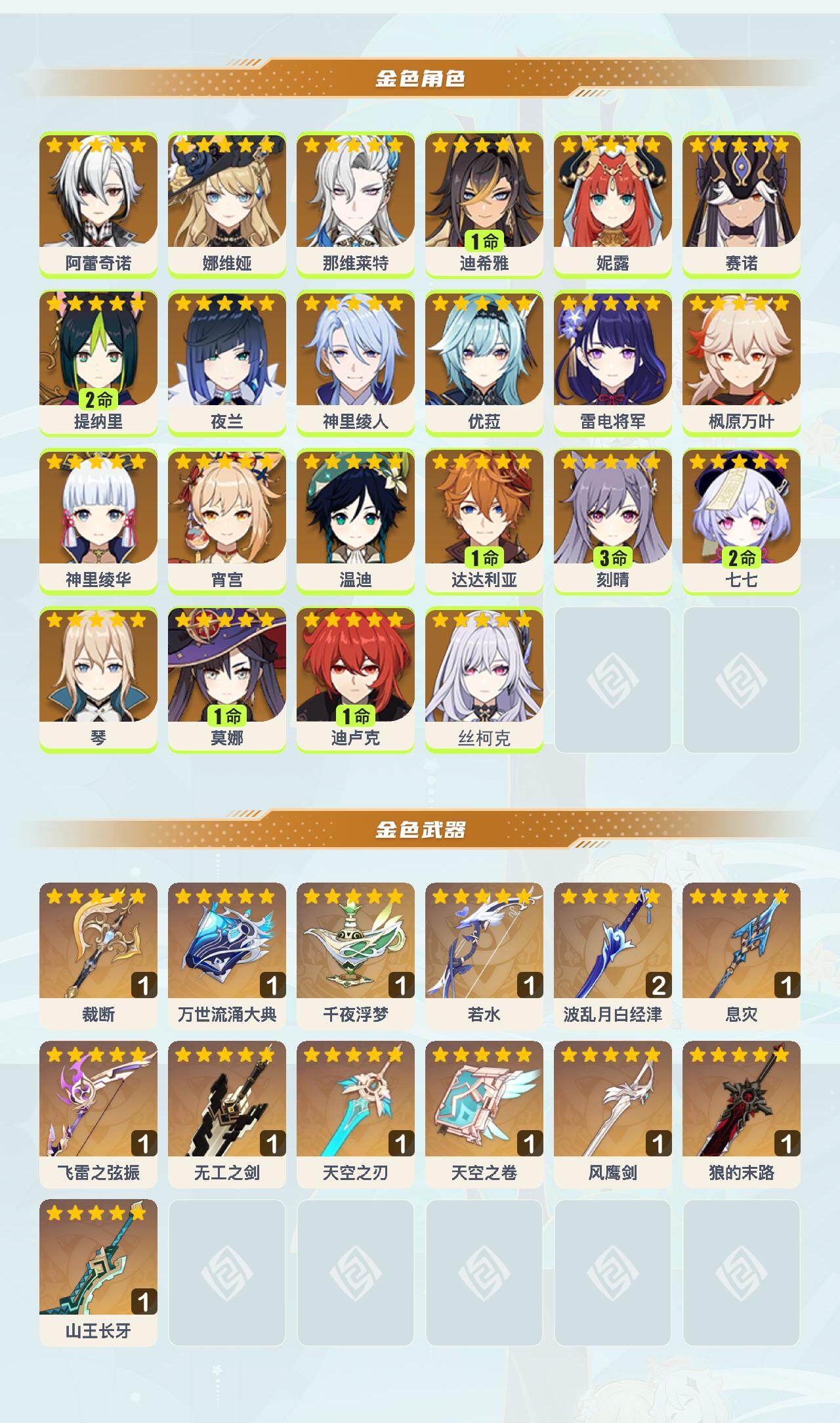 0命阿蕾奇诺,0命娜维娅,0命那维莱特,1命迪希雅,0命妮露,0命赛诺,2命提纳里,0命夜兰,0命神里绫人,0命优菈,0命雷电将军,0命枫原万叶,0命神里绫华,0命宵宫,0命温迪,1命达达利亚,3命刻晴,2命七七,0命琴,1命莫娜,1命迪卢克,0命丝柯克,精1裁断,精1万世流涌大典,精1千夜浮梦,精1若水,精2波乱月白经津,精1息灾,精1飞雷之弦振,精1无工之剑,精1天空之刃,精1天空之卷,精1风鹰剑,精1狼的末路,精1山王长牙