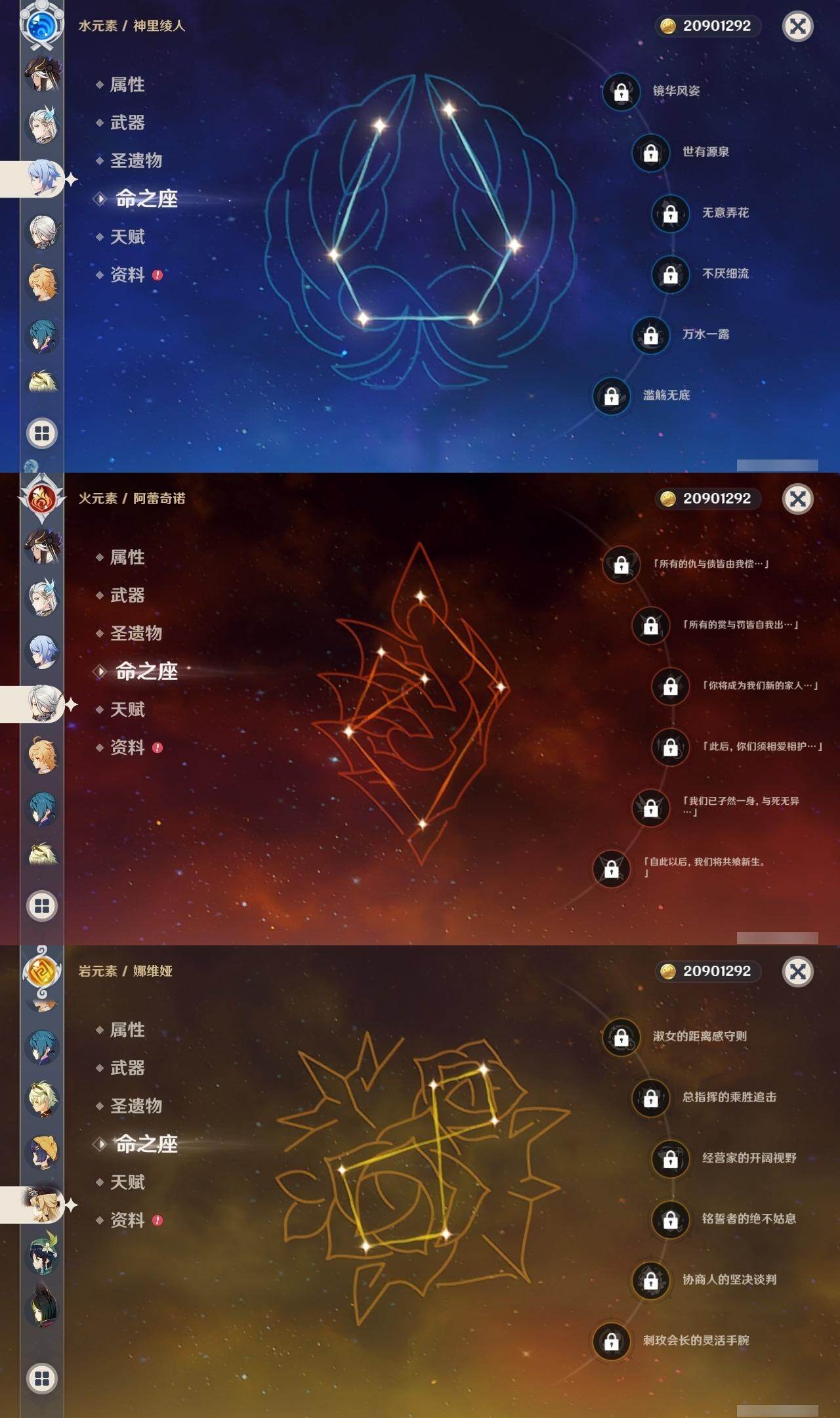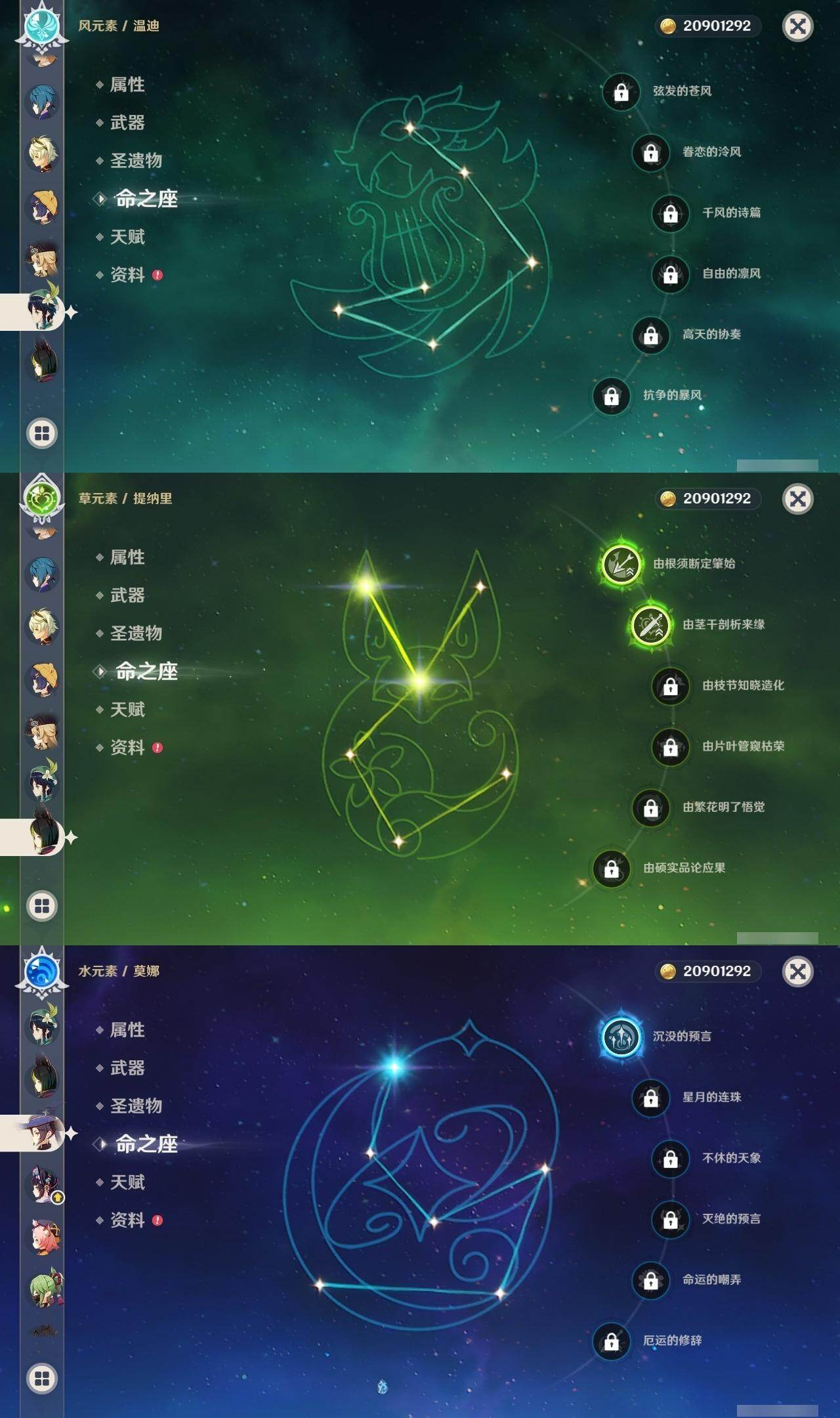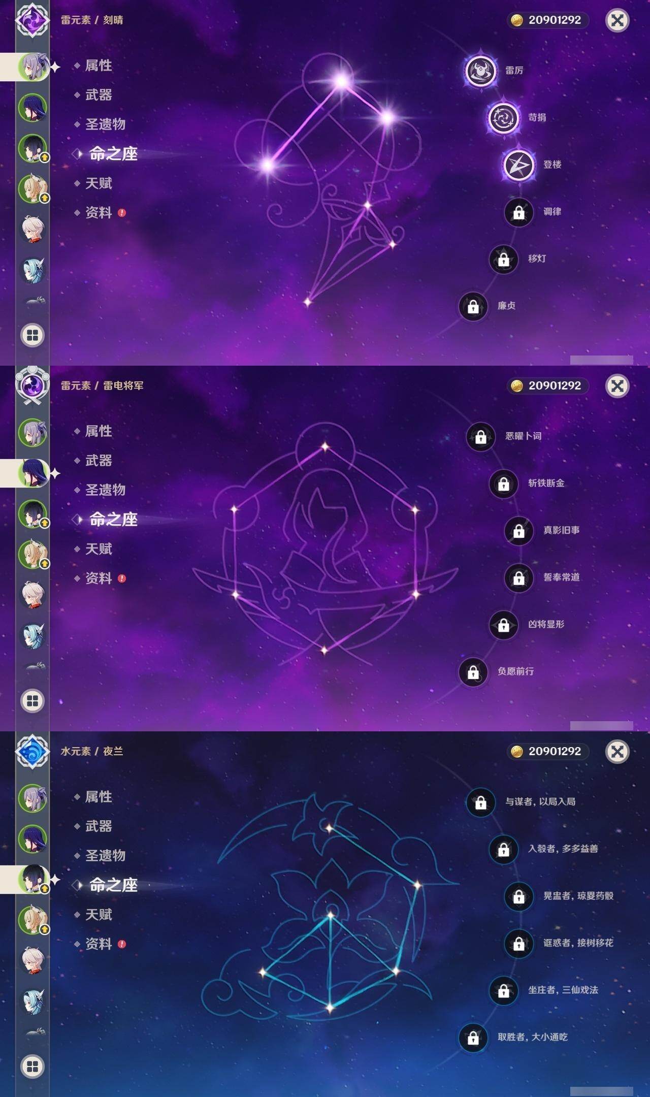 0命阿蕾奇诺,0命娜维娅,0命那维莱特,1命迪希雅,0命妮露,0命赛诺,2命提纳里,0命夜兰,0命神里绫人,0命优菈,0命雷电将军,0命枫原万叶,0命神里绫华,0命宵宫,0命温迪,1命达达利亚,3命刻晴,2命七七,0命琴,1命莫娜,1命迪卢克,0命丝柯克,精1裁断,精1万世流涌大典,精1千夜浮梦,精1若水,精2波乱月白经津,精1息灾,精1飞雷之弦振,精1无工之剑,精1天空之刃,精1天空之卷,精1风鹰剑,精1狼的末路,精1山王长牙