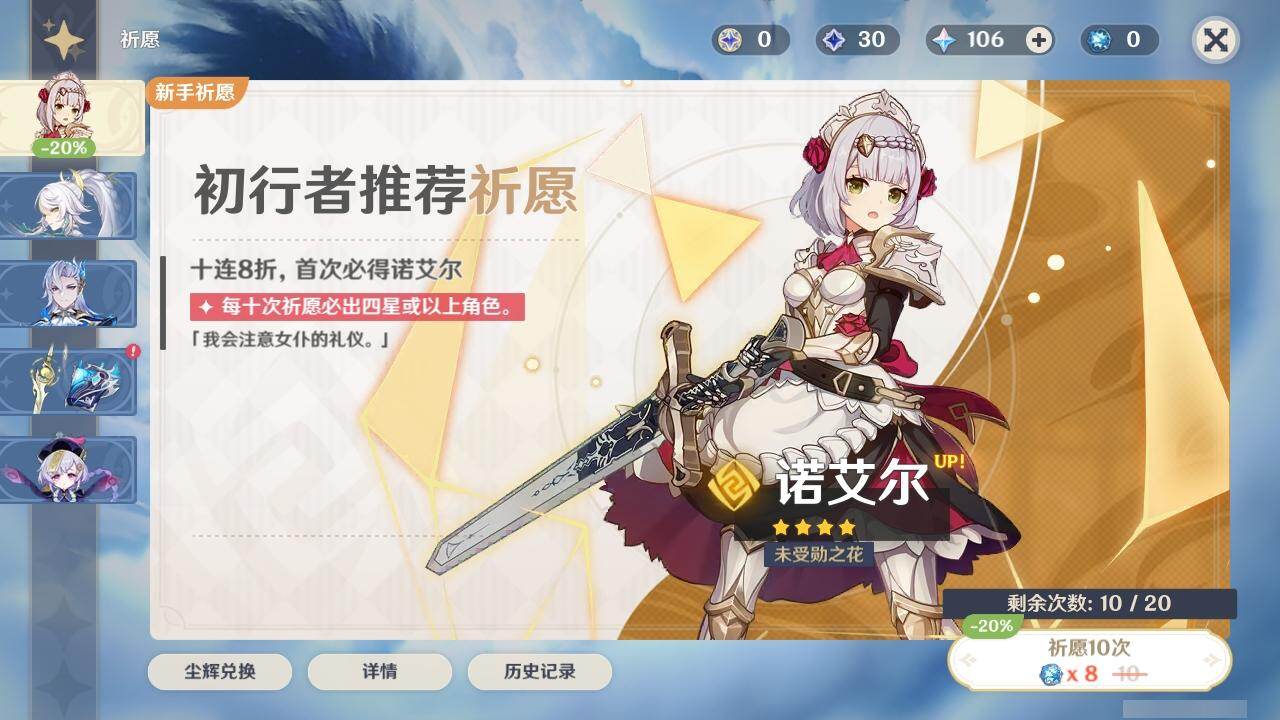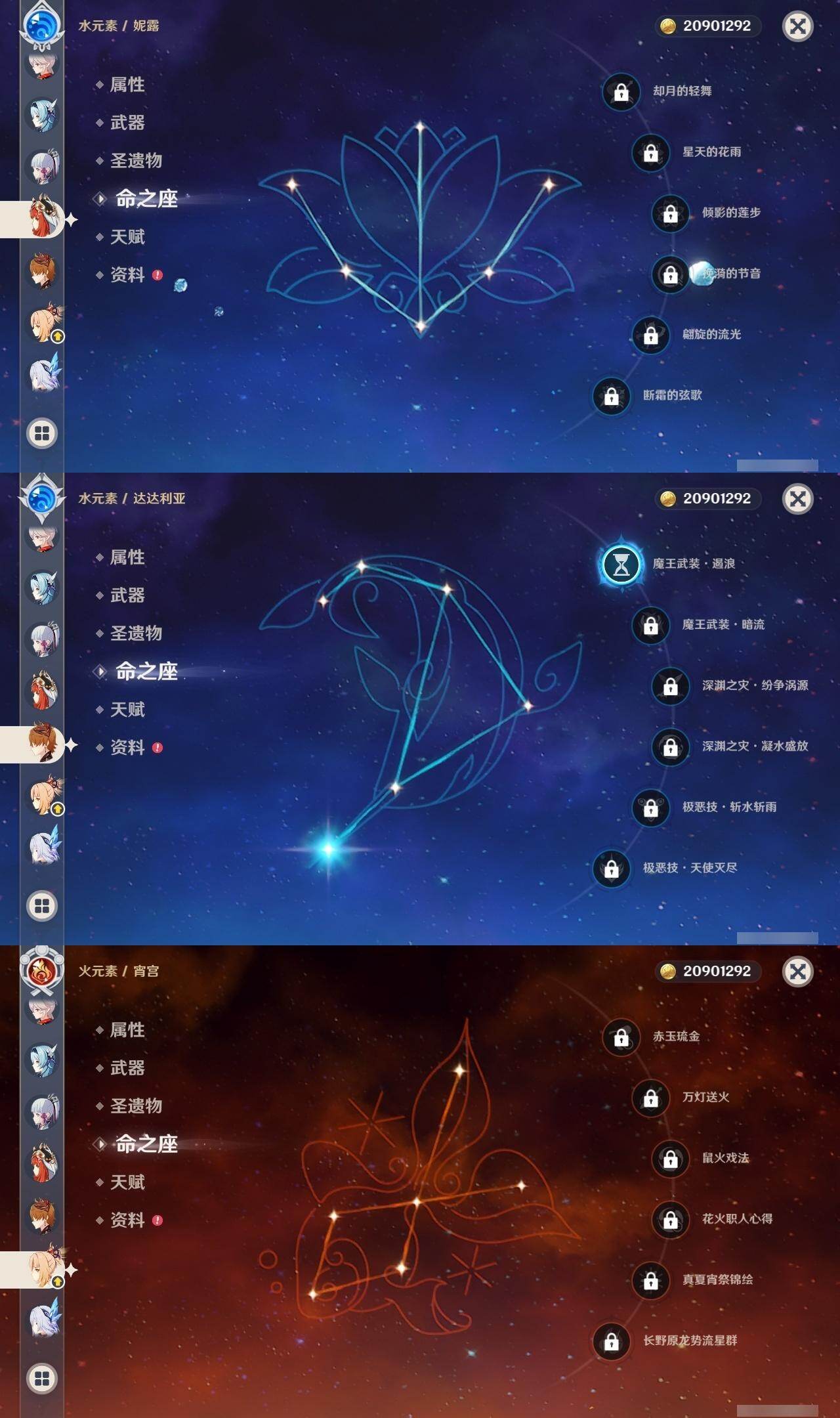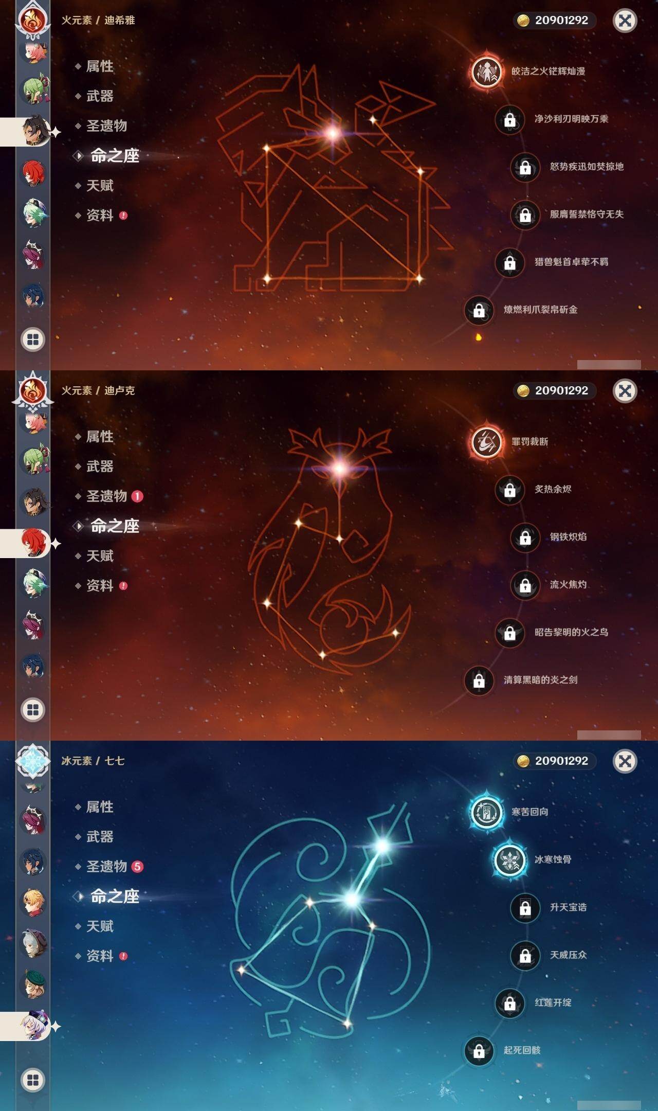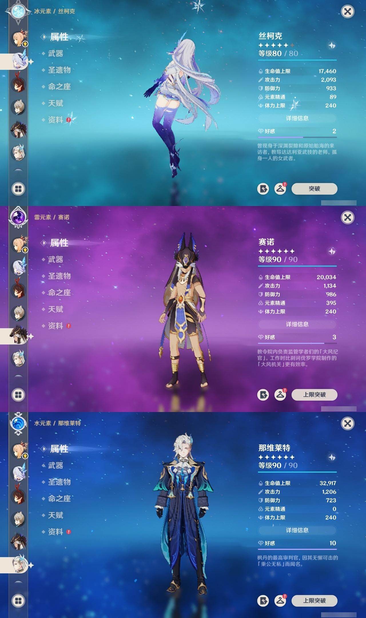 0命阿蕾奇诺,0命娜维娅,0命那维莱特,1命迪希雅,0命妮露,0命赛诺,2命提纳里,0命夜兰,0命神里绫人,0命优菈,0命雷电将军,0命枫原万叶,0命神里绫华,0命宵宫,0命温迪,1命达达利亚,3命刻晴,2命七七,0命琴,1命莫娜,1命迪卢克,0命丝柯克,精1裁断,精1万世流涌大典,精1千夜浮梦,精1若水,精2波乱月白经津,精1息灾,精1飞雷之弦振,精1无工之剑,精1天空之刃,精1天空之卷,精1风鹰剑,精1狼的末路,精1山王长牙