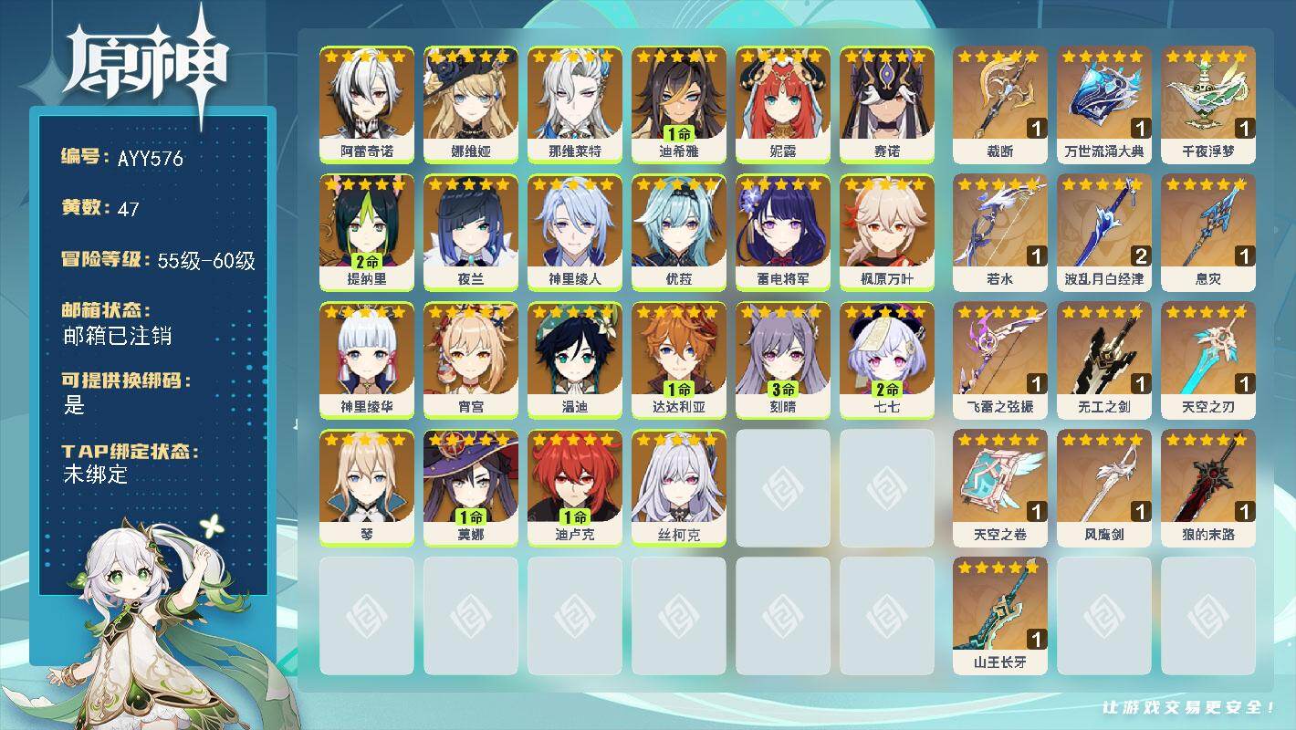 [16891109]60级/47黄/男主/22个五星角色/13个五星武器 0命阿蕾奇诺,0命娜维娅,0命那维莱特,1命迪希雅,0命妮露,0命赛诺,2命提纳里,0命夜兰,0命神里绫人,0命优菈,0命雷电将军,0命枫原万叶,0命神里绫华,0命宵宫,0命温迪,1命达达利亚,3命刻晴,2命七七,0命琴,1命莫娜,1命迪卢克,0命丝柯克,精1裁断,精1万世流涌大典,精1千夜浮梦,精1若水,精2波乱月白经津,精1息灾,精1飞雷之弦振,精1无工之剑,精1天空之刃,精1天空之卷,精1风鹰剑,精1狼的末路,精1山王长牙
