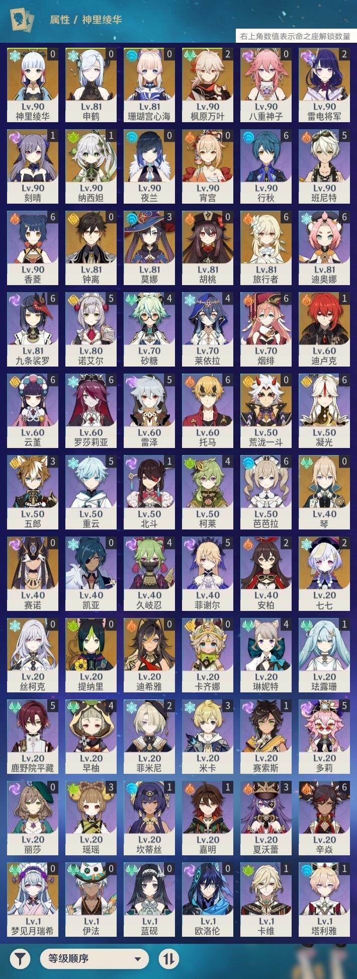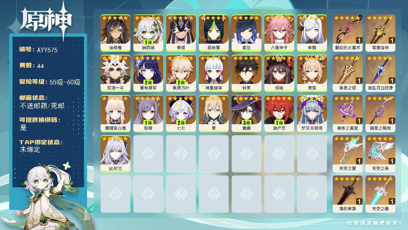 - [15248648]59级/31黄/女主/19个五星角色/8个五星武器 0命白术,0命艾尔海森,0命纳西妲,1命提纳里,0命夜兰,0命申鹤,1命雷电将军,0命枫原万叶,0命神里绫华,0命钟离,0命甘雨,0命宵宫,0命温迪,0命刻晴,0命七七,1命琴,0命莫娜,1命迪卢克,0命玛薇卡,精1裁叶萃光,精1千夜浮梦,精1薙草之稻光,精1护摩之杖,精1四风原典,精1阿莫斯之弓,精1天空之刃,精1狼的末路