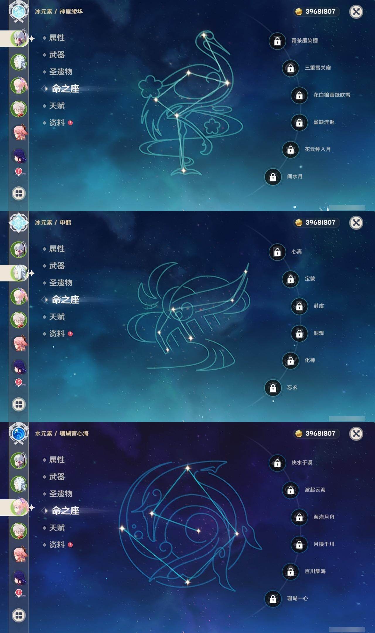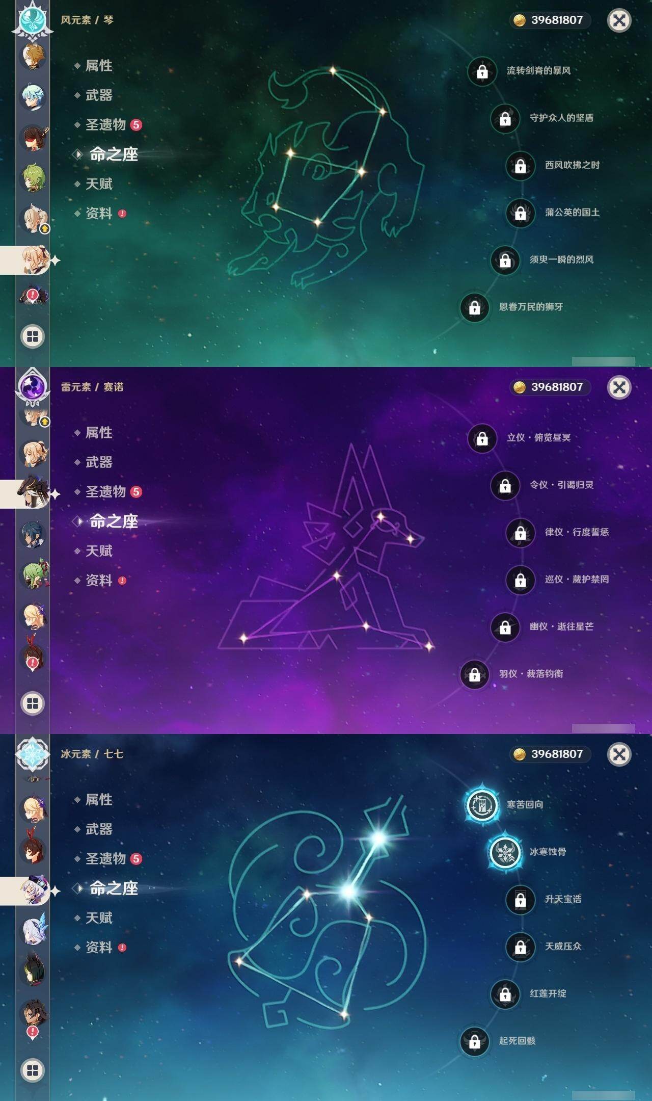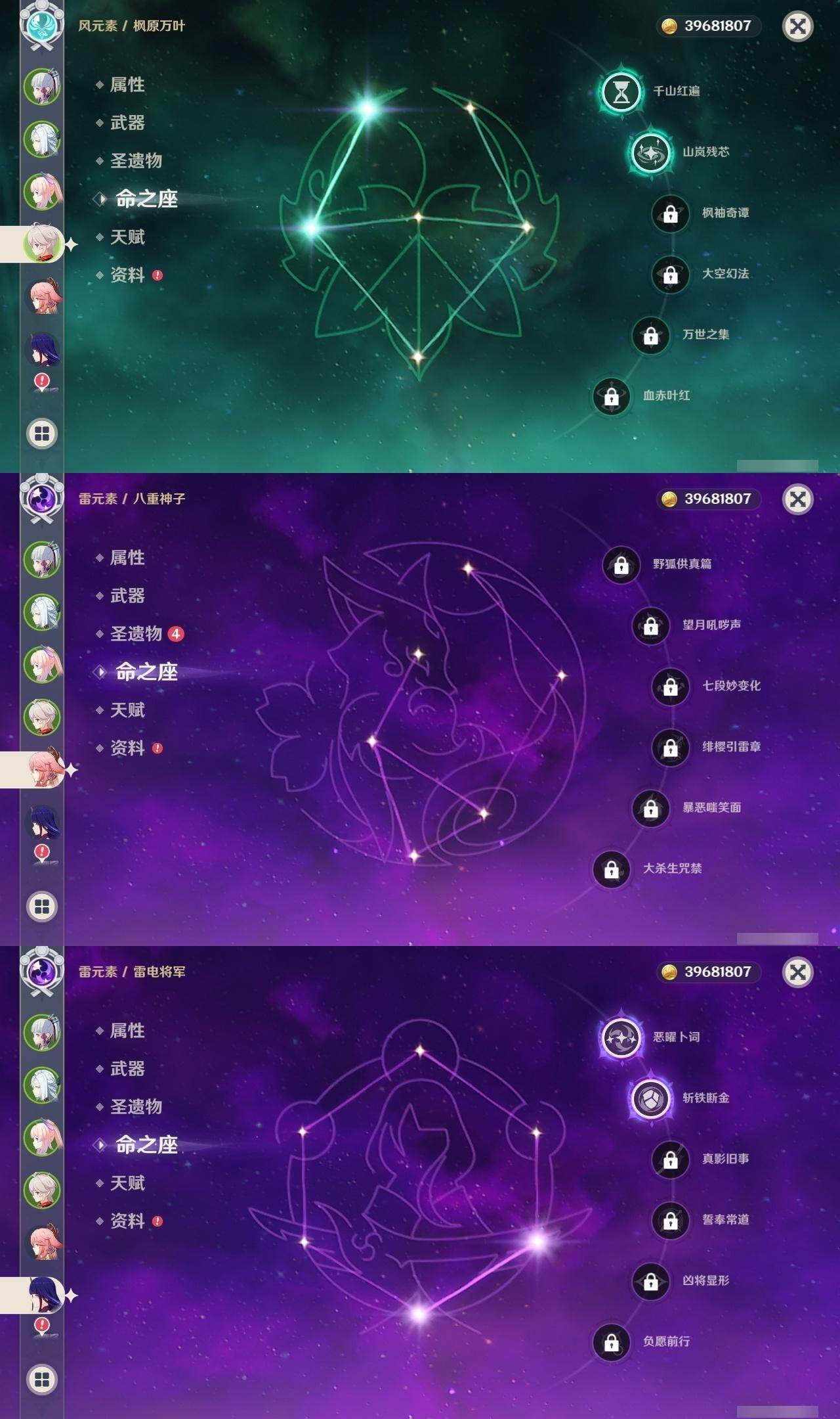 0命迪希雅,1命纳西妲,0命赛诺,0命提纳里,0命夜兰,0命八重神子,0命申鹤,0命荒泷一斗,2命雷电将军,2命枫原万叶,0命神里绫华,0命钟离,0命胡桃,0命宵宫,0命珊瑚宫心海,1命刻晴,2命七七,0命琴,3命莫娜,1命迪卢克,0命梦见月瑞希,0命丝柯克,精1最初的大魔术,精1苇海信标,精1圣显之钥,精1波乱月白经津,精1神乐之真意,精1薙草之稻光,精1天空之翼,精1天空之卷,精1狼的末路,精1天空之傲