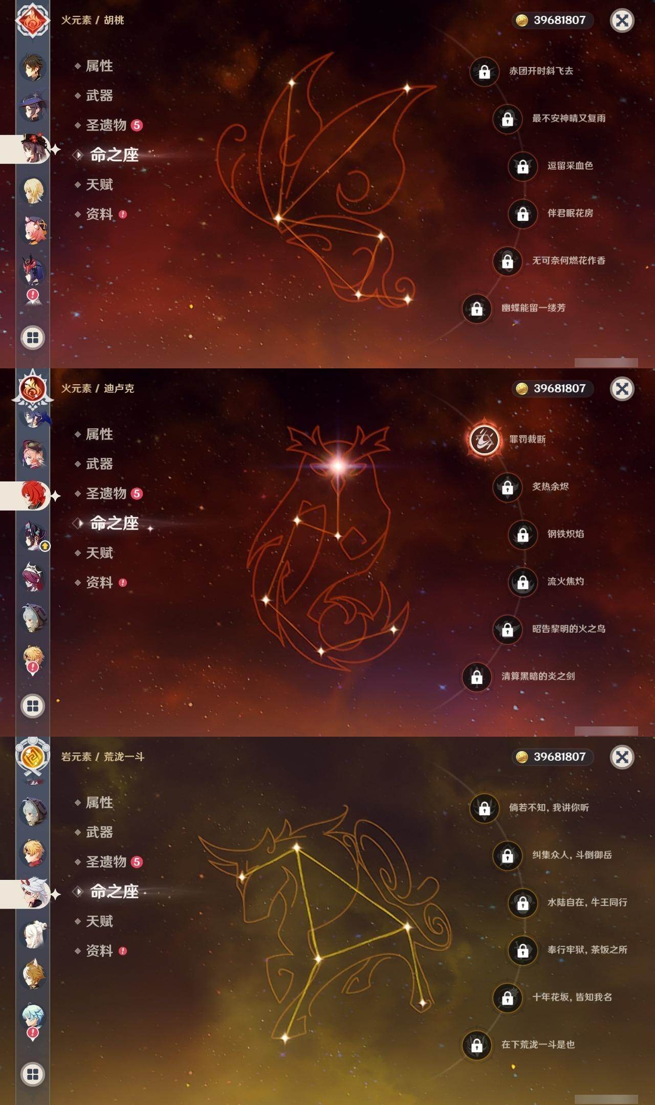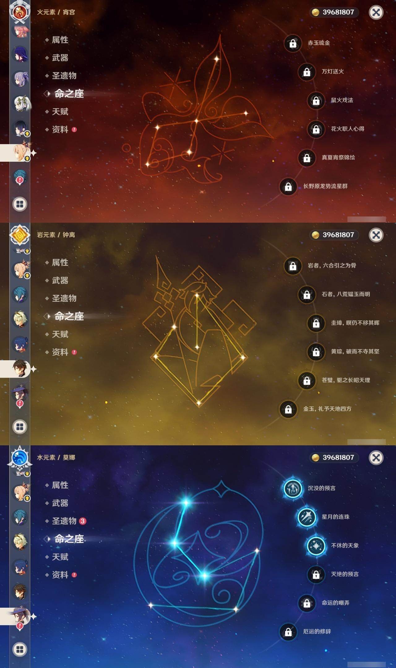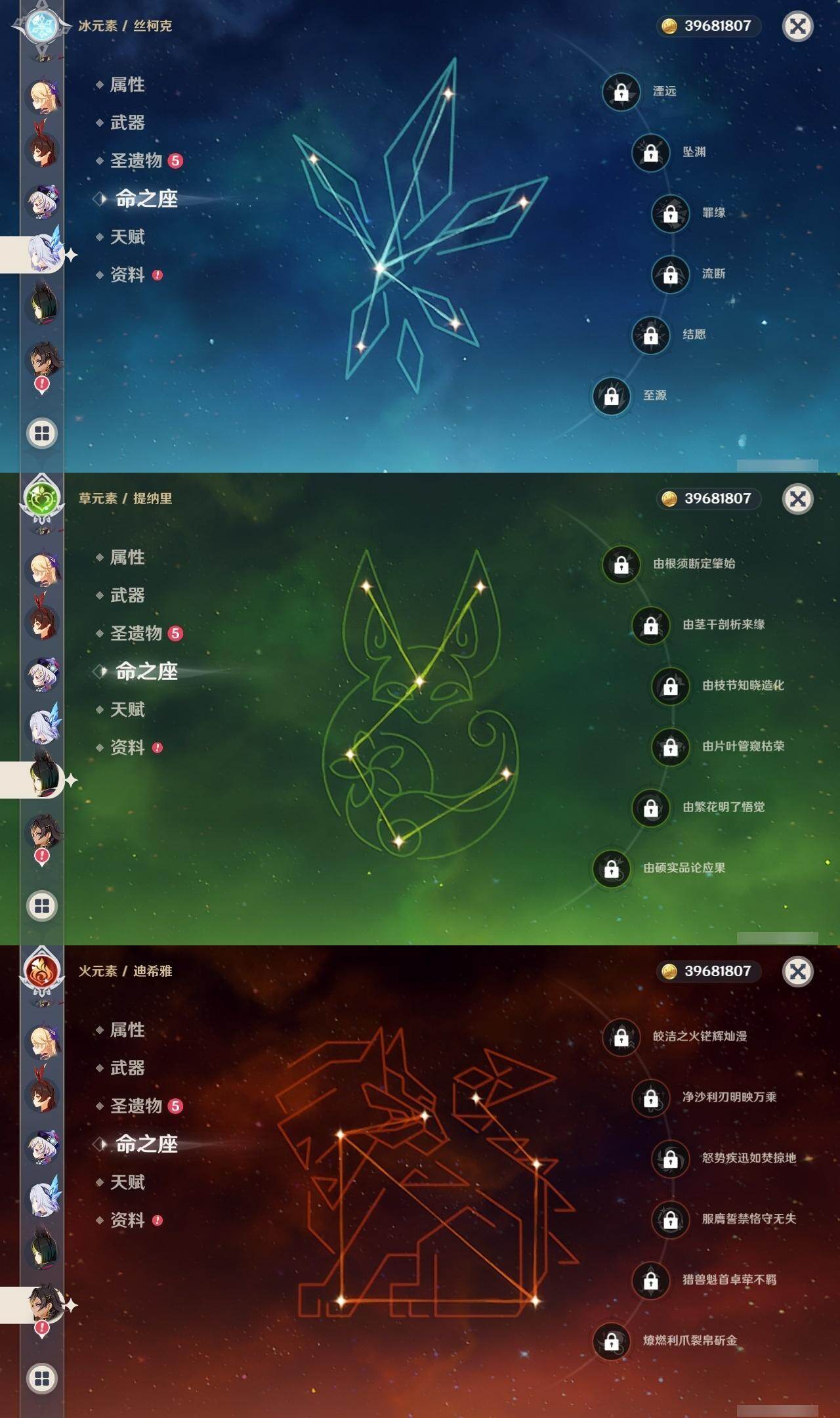 0命迪希雅,1命纳西妲,0命赛诺,0命提纳里,0命夜兰,0命八重神子,0命申鹤,0命荒泷一斗,2命雷电将军,2命枫原万叶,0命神里绫华,0命钟离,0命胡桃,0命宵宫,0命珊瑚宫心海,1命刻晴,2命七七,0命琴,3命莫娜,1命迪卢克,0命梦见月瑞希,0命丝柯克,精1最初的大魔术,精1苇海信标,精1圣显之钥,精1波乱月白经津,精1神乐之真意,精1薙草之稻光,精1天空之翼,精1天空之卷,精1狼的末路,精1天空之傲