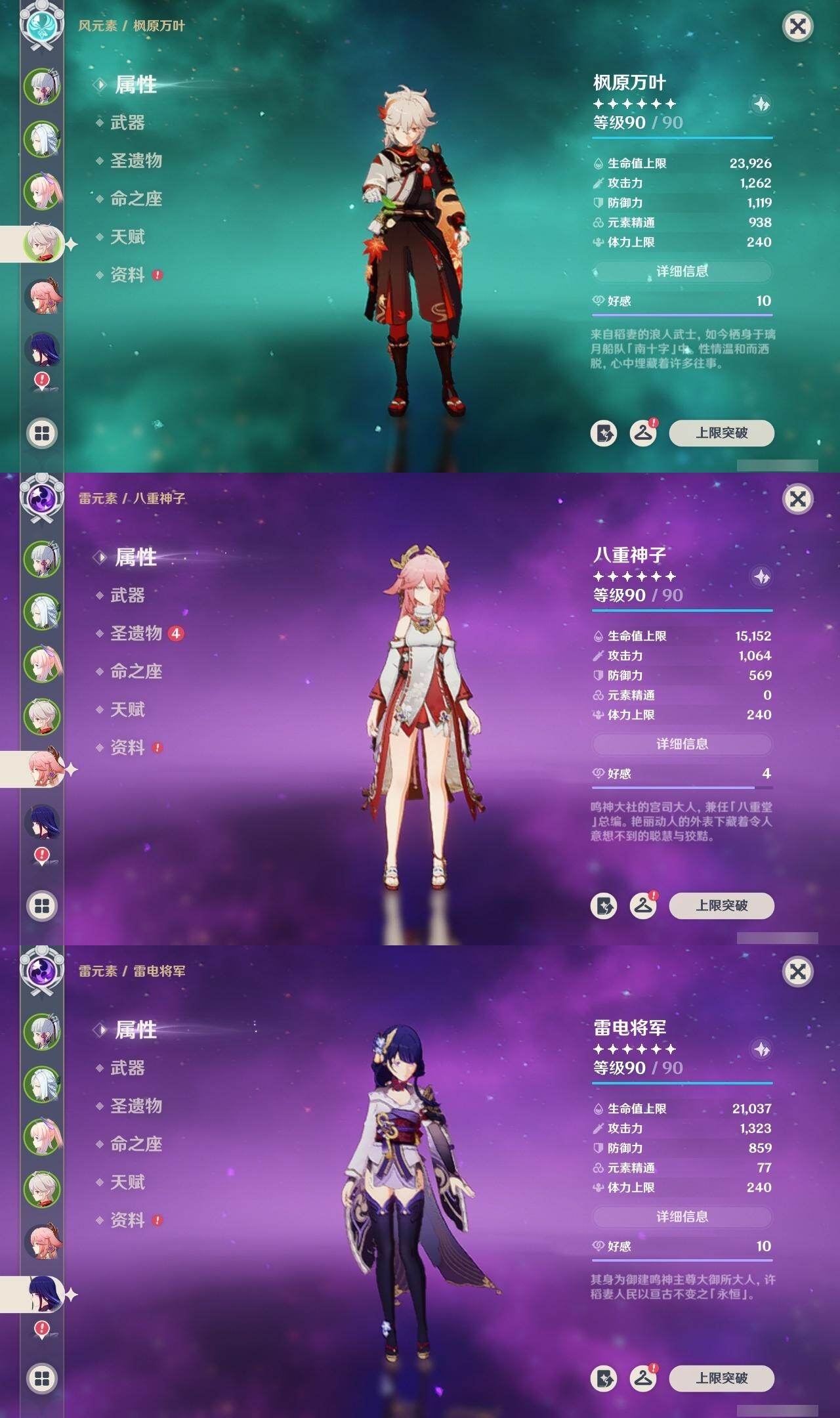 神里凌华,申鹤,珊瑚宫心海,枫原万叶,八重神子,雷电将军,刻晴,宵宫,钟离,莫娜,胡桃,迪卢克,荒泷一斗,琴,七七