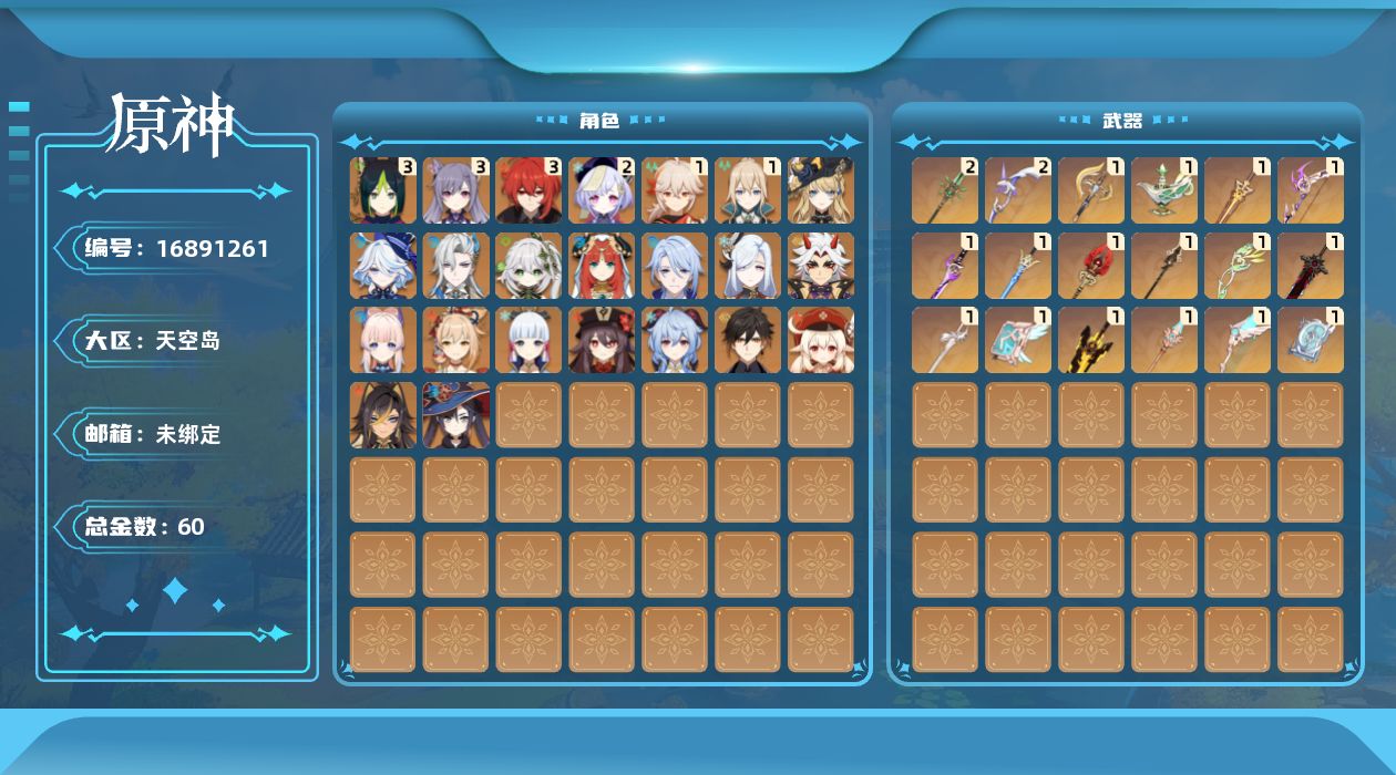 0命娜维娅,0命芙宁娜,0命那维莱特,0命迪希雅,0命纳西妲,0命妮露,3命提纳里,0命神里绫人,0命申鹤,0命荒泷一斗,1命枫原万叶,0命神里绫华,0命钟离,0命胡桃,0命甘雨,0命宵宫,0命可莉,0命珊瑚宫心海,3命刻晴,2命七七,1命琴,0命莫娜,3命迪卢克,精1裁断,精1千夜浮梦,精1圣显之钥,精1猎人之径,精1飞雷之弦振,精1雾切之回光,精1苍古自由之誓,精1无工之剑,精1护摩之杖,精1四风原典,精2和璞鸢,精1天空之脊,精1贯虹之槊,精1天空之翼,精2阿莫斯之弓,精1天空之卷,精1风鹰剑,精1狼的末路