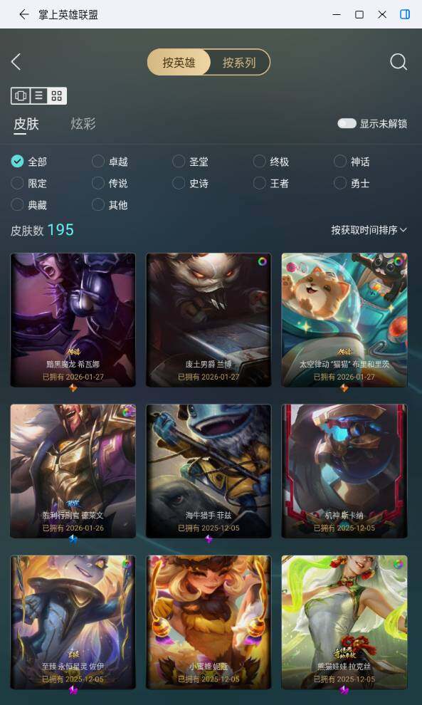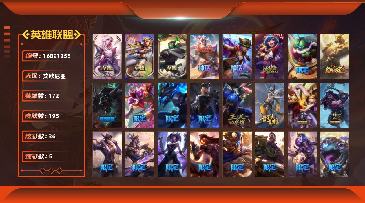 [16891255]黄金段位-172英雄-195皮肤-36炫彩-0终极-8神话-35限定-16传说-56史诗